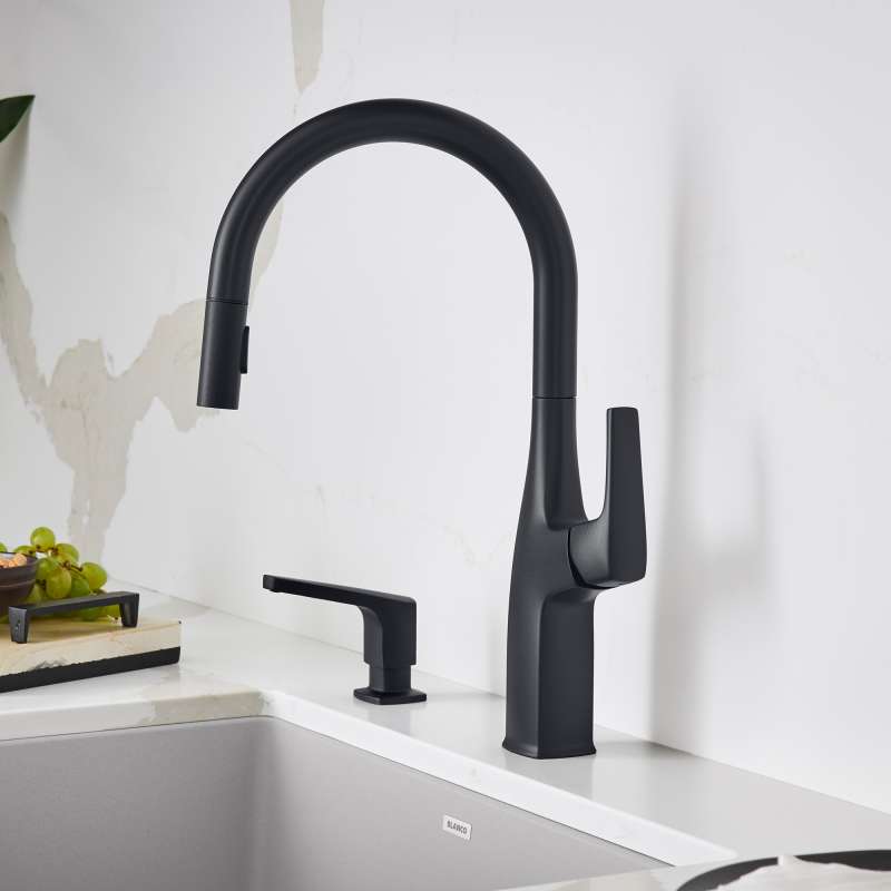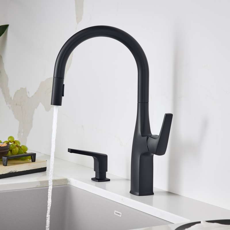 Where form and function unite. The BLANCO RIVANA HIGH-ARC KITCHEN FAUCET delivers powerful performance with sleek design aesthetics. A clean, square design at the faucet base transitions into a rounded spout, blending organic shapes with ergonomic function. The BLANCO RIVANA features a concealed spray-head for a streamlined, modern design. Featuring an insulated handspray with a dual-spray button, easily toggle between a solid stream or wide spray.