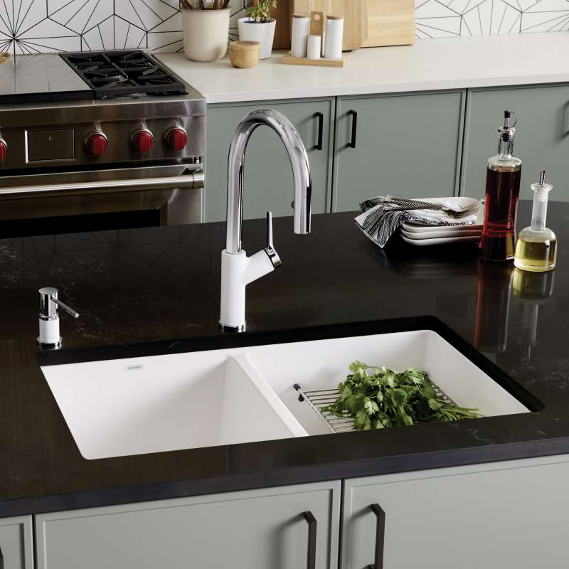 The PRECIS 29 50/50 Double Bowl Undermount Kitchen Sink offers clean lines and a simple but spacious double bowl design. The functionality of a double sink offers plenty of room for rinsing, washing, soaking, spraying and straining operations. The ideal choice for those who wash dishes by hand, you can stack dirty dishes and utensils in one sink while prepping in the other. Made of SILGRANIT(R), PRECIS kitchen sinks are engineered to withstand heavy cookware and hot bakeware. Silgranit sinks are not only strong but also beautiful, available in a range of nature-inspired colors that effortlessly complement the latest kitchen trends. Combine the PRECIS sink with a BLANCO faucet and accessories to create a BLANCO UNIT; a seamlessly integrated kitchen solution designed to transform kitchen chores into joyful experiences. Everything you need to drink, prep and clean, all in one place.
