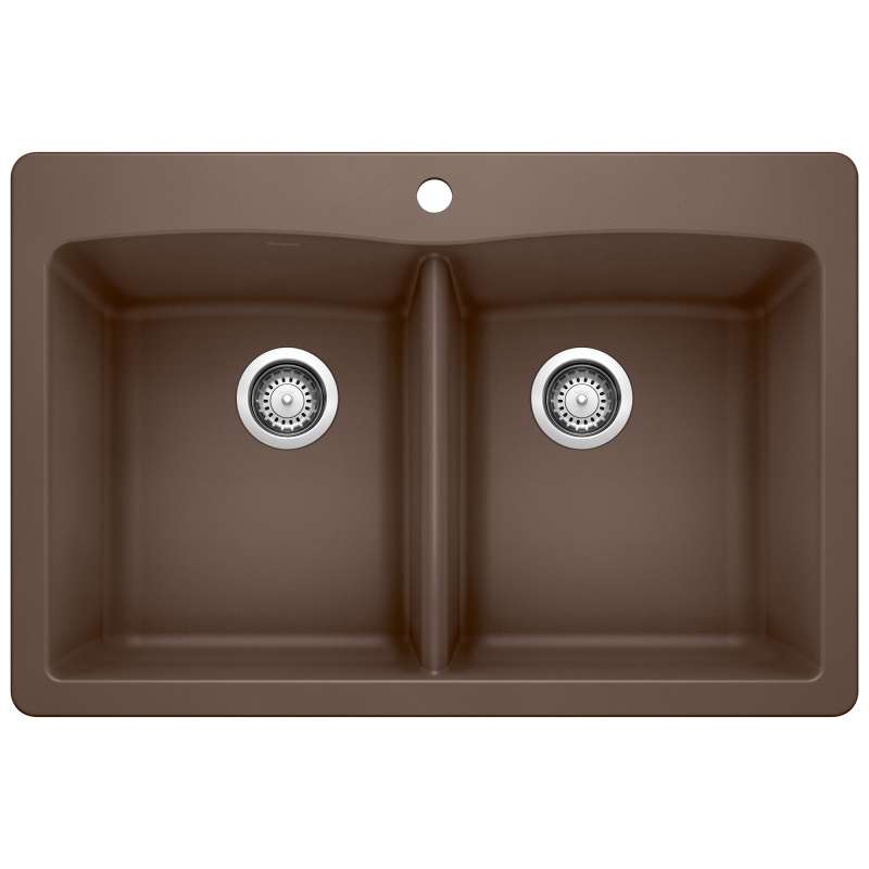 The BLANCO DIAMOND 5/5 DOUBLE BOWL DUAL MOUNT KITCHEN SINK features a 5/5 bowl design, offering plenty of room for rinsing, washing, soaking, spraying and straining operations. The ideal choice for those who wash dishes by hand, you can stack dirty dishes and utensils in one sick while prepping in the other. This kitchen sink is made of SILGRANIT, a patented, certified granite composite material that is engineered to take on the toughest kitchen tasks. SILGRANIT is heat, scratch, stain, chip and impact resistant, making it stronger and more durable than other sink materials. Beautiful and highly functional with its non-porous, hygienic surface, it pushes away liquids and residue resulting in a low maintenance, easy to clean, long-lasting material. The DIAMOND double bowl kitchen sink easily conquers the demands of everyday life.