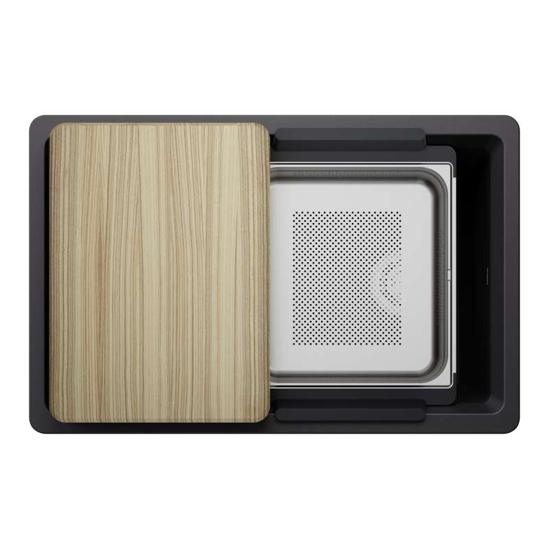 The INTEOS 30 workstation sink simplifies your workflow while keeping you organized. Adaptable accessories go beyond basic meal prep while the Stack & Store system allows you to neatly stack accessories or store them below the sink. INTEOS workstations come with a wood cutting board, large colander and accessory holder that conveniently slide along the sink's angled edge. Enhance meal prep with optional INTEOS accessories, including small colanders and oven-safe small and large trays. Serve stunning food spreads from your sink for a gourmet gathering. Streamline clean-up with the INTEOS dish rack, protective sink grid and storage bag. The INTEOS 30 offers a generous 9" bowl depth and fits into a 33" minimum cabinet size. Made of BLANCO's patented SILGRANIT(R) composite material, INTEOS sinks are engineered to withstand heavy cookware and hot bakeware in a range of nature-inspired colors. Combine with a BLANCO faucet, filtration and more to create a BLANCO UNIT; a seamless, fully-integrated kitchen solution.