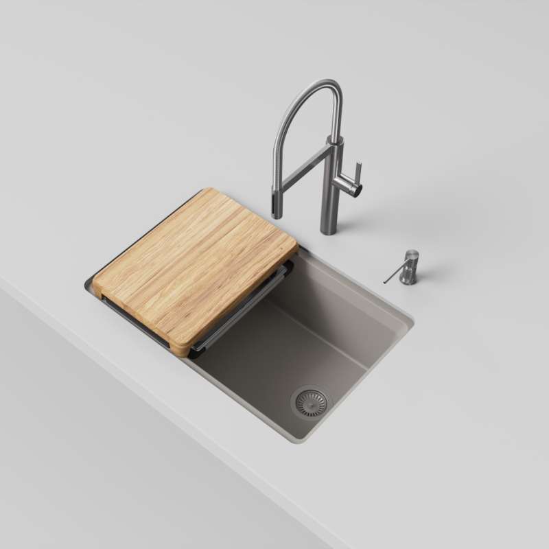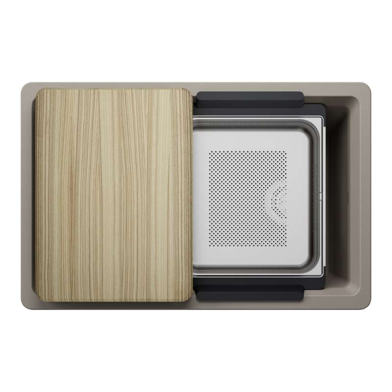• Included INTEOS workstation sink accessories: Wood Cutting Board, Large Colander and Accessory Holder