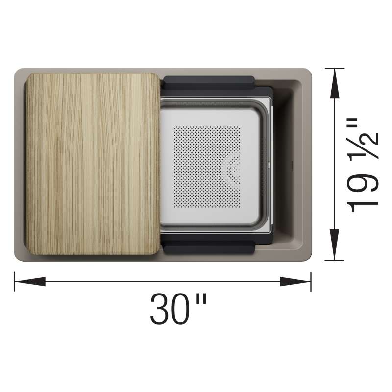 The INTEOS 30 workstation sink simplifies your workflow while keeping you organized. Adaptable accessories go beyond basic meal prep while the Stack & Store system allows you to neatly stack accessories or store them below the sink. INTEOS workstations come with a wood cutting board, large colander and accessory holder that conveniently slide along the sink's angled edge. Enhance meal prep with optional INTEOS accessories, including small colanders and oven-safe small and large trays. Serve stunning food spreads from your sink for a gourmet gathering. Streamline clean-up with the INTEOS dish rack, protective sink grid and storage bag. The INTEOS 30 offers a generous 9" bowl depth and fits into a 33" minimum cabinet size. Made of BLANCO's patented SILGRANIT(R) composite material, INTEOS sinks are engineered to withstand heavy cookware and hot bakeware in a range of nature-inspired colors. Combine with a BLANCO faucet, filtration and more to create a BLANCO UNIT; a seamless, fully-integrated kitchen solution.