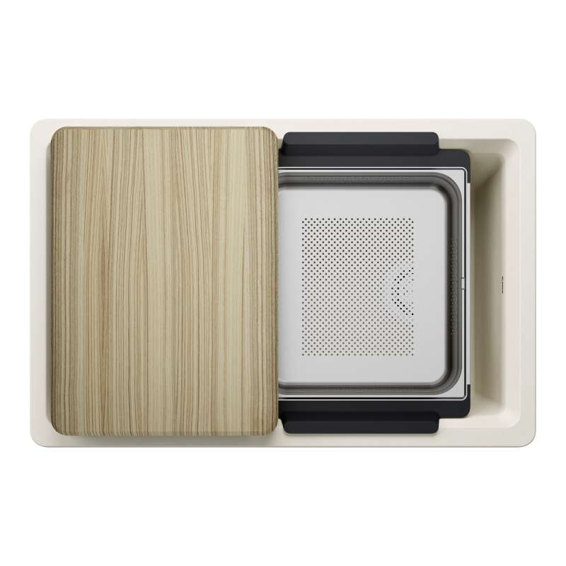The INTEOS 30 workstation sink simplifies your workflow while keeping you organized. Adaptable accessories go beyond basic meal prep while the Stack & Store system allows you to neatly stack accessories or store them below the sink. INTEOS workstations come with a wood cutting board, large colander and accessory holder that conveniently slide along the sink's angled edge. Enhance meal prep with optional INTEOS accessories, including small colanders and oven-safe small and large trays. Serve stunning food spreads from your sink for a gourmet gathering. Streamline clean-up with the INTEOS dish rack, protective sink grid and storage bag. The INTEOS 30 offers a generous 9" bowl depth and fits into a 33" minimum cabinet size. Made of BLANCO's patented SILGRANIT(R) composite material, INTEOS sinks are engineered to withstand heavy cookware and hot bakeware in a range of nature-inspired colors. Combine with a BLANCO faucet, filtration and more to create a BLANCO UNIT; a seamless, fully-integrated kitchen solution.