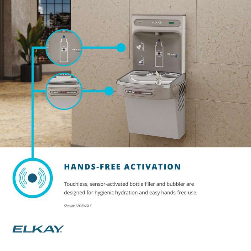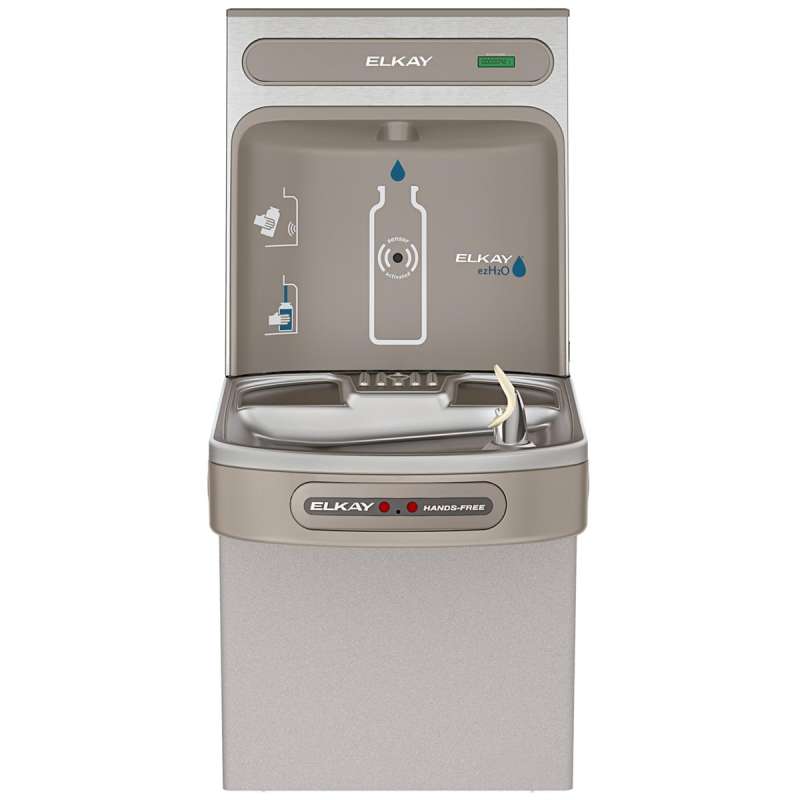 The Elkay EZH2O Bottle Filling Station delivers a clean quick water bottle fill and enhances sustainability by minimizing our dependency on disposable plastic bottles. Complete hands-free cooler and bottle filling station in a consolidated space saving ADA compliant design. NEW Versatile Bi-Level cooler design allows for standard cooler installation of high-left/low-right or the alternate reverse cooler installation.