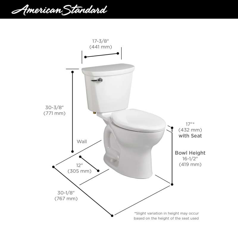 The Cadet PRO Chair-Height Elongated Toilet from American Standard is plumber tested and plumber approved. The Cadet is backed by an industry-leading warranty that includes limited lifetime on chinaware, limited 5 years on mechanical parts. This chair-height toilet features an elongated bowl for optimal comfort. Engineered for high-efficiency, low consumption, it uses 1.28 gallons per flush, 20% less water than a regular toilet, and is WaterSense(R) certified, your assurance of optimal water savings, quality and performance. EverClean(R) antimicrobial surface to protect against mold, mildew, odor- and stain-causing bacteria.