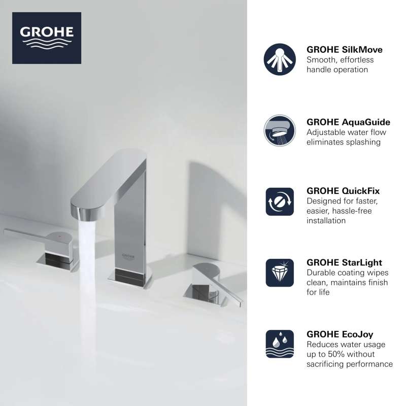 Elegant or minimalist, the GROHE Plus Wideset Bathroom Faucet combines the clean, linear angles of a cube with the gentle curves of a circle making it a distinctive choice no matter the design aesthetic. Engineered to bring comfort and convenience to your bathroom, the Plus Wideset Faucet features the durable GROHE StarLight coating for easy care and lasting beauty.