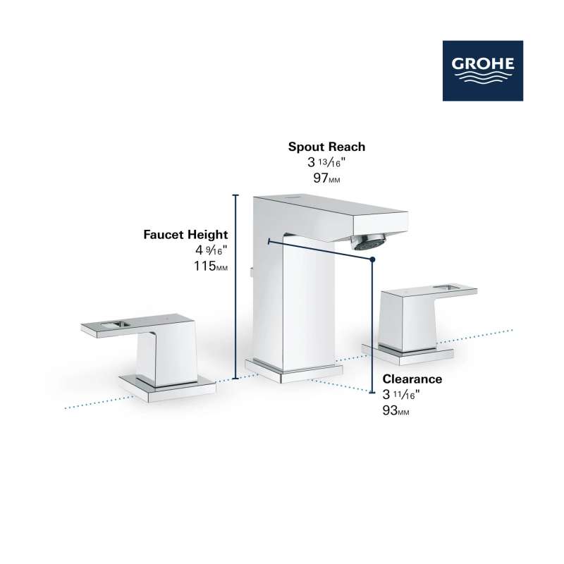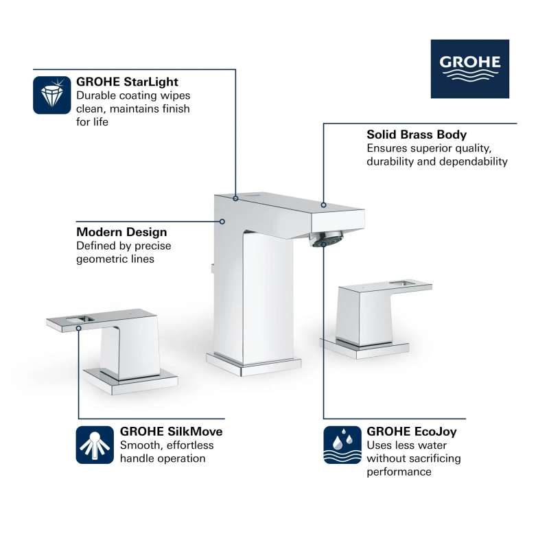 The GROHE Eurocube Widespread Bathroom Faucet combines precise geometric lines with superior performance for the well-appointed bathroom. Eurocube is equipped with a ceramic disc valve for drip-free performance.