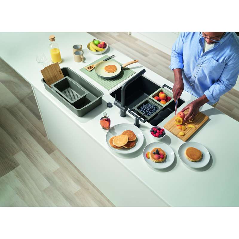All-In is the flexible food preparation system that transforms your sink into a stylish and playful workstation designed to bring more flow to your kitchen and life. Well-equipped and intuitive, this modular accessory system has all you need to prepare meals easily, saving you time and space and allowing you to shift seamlessly between different tasks. So, for great meals with no interruptions, it all comes together with All-In.
