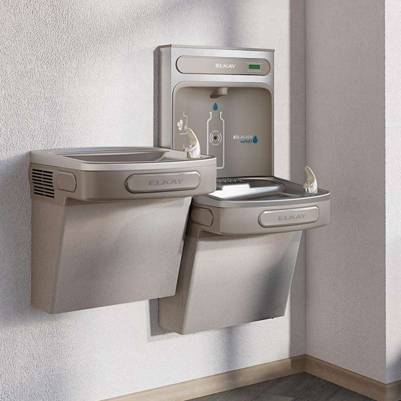 The Elkay EZH2O Bottle Filling Station delivers a clean quick water bottle fill and enhances sustainability by minimizing our dependency on disposable plastic bottles. Complete cooler and bottle filling station in a consolidated space saving ADA compliant design. NEW Versatile Bi-Level cooler design allows for standard cooler installation of high-left/low-right or the alternate reverse cooler installation.