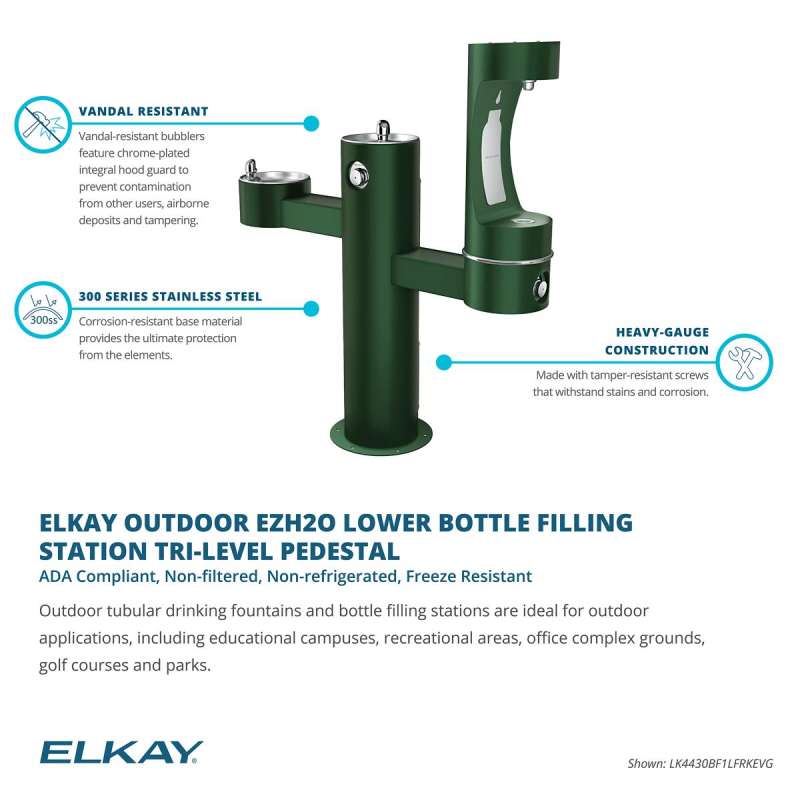 Outdoor Bottle Filling Stations ideal for educational campuses and recreational areas. Powder-coated exterior over a corrosion-resistant, 300 Series stainless steel base material to provide protection from the elements.