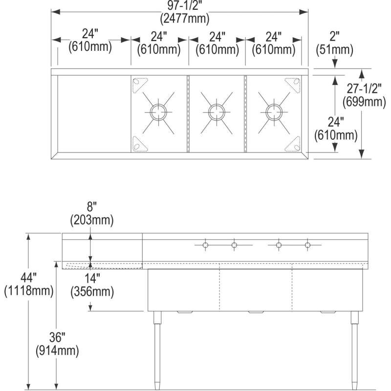 Weldbilt Stainless Steel 97-1/2" X 27-1/2" X 14" Floor Mount Triple Compartment 2-Hole Scullery Sink W/Left Drainboard, WNSF8372L2 Buffed Satin
