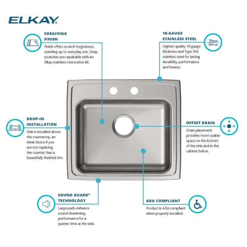 An Elkay Lustertone Classic stainless steel sink looks as great on day 3,000 as it does on day one. The rich, uniform grain is scratch resistant for heavy-duty use, whether it's a kitchen sink or a prep, bar, laundry or commercial sink. Light scratches, which occur with everyday use, naturally blend into the finish of this durable sink with time. Deeper scratches are repairable with an Elkay stainless steel restoration kit. Available in ADA depths.