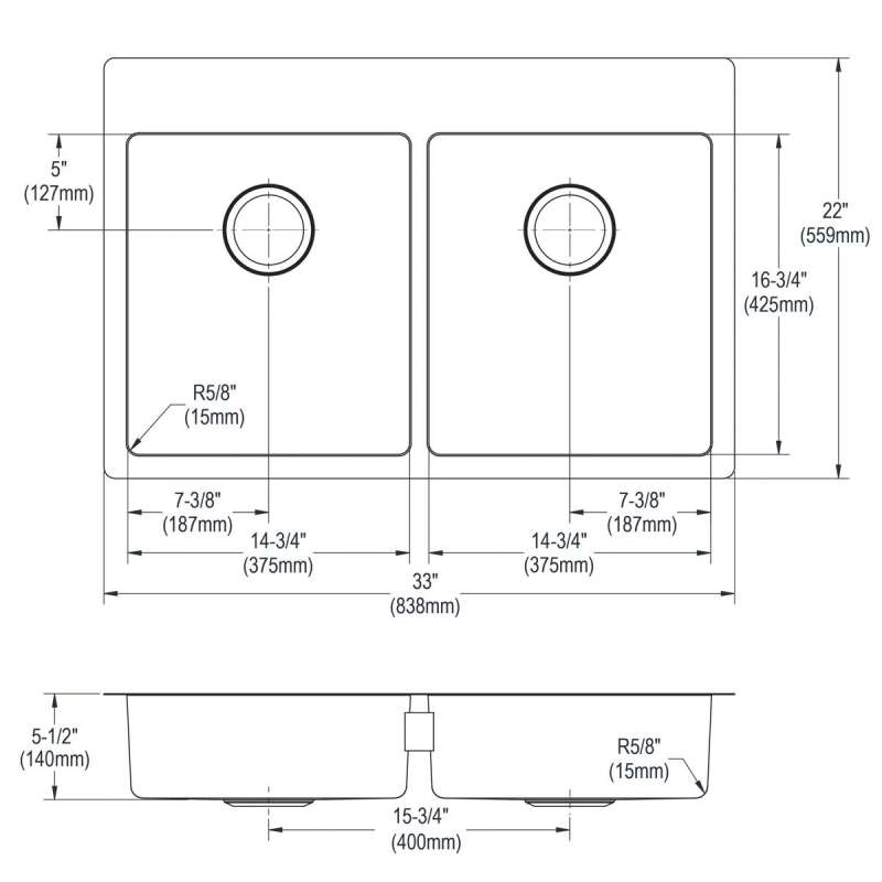 Countertop Cutout Dimensions 32-3/8" x 21-3/8" (822mm x 543mm) with 1/2" (12mm) corner radius
