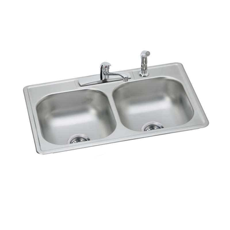 Dayton Stainless Steel 33" X 22" X 7-1/16" 4-Hole Equal Double Bowl Drop-In Sink And Faucet Kit, DD233224DF Satin