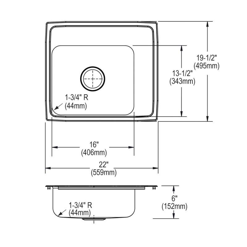 Lustertone Classic Stainless Steel 22" X 19-1/2" X 6" Single Bowl Drop-In Classroom Ada Sink, DRKAD222060R2 Lustrous Satin