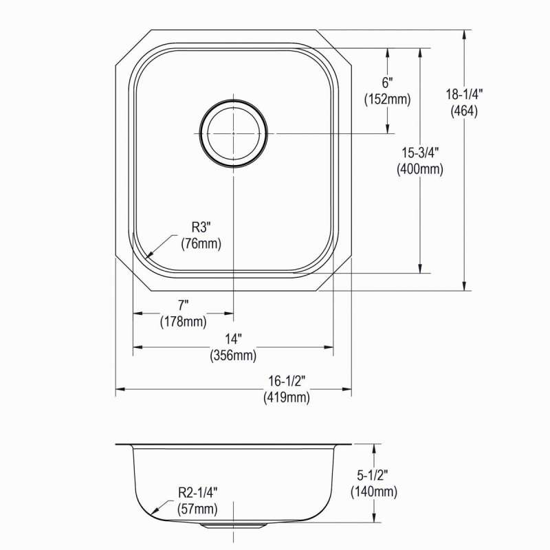 Stainless Steel Sink 16-1/2" X 18-1/4" X 5-1/2" Undermount Single Bowl 20 Gauge, MFV105