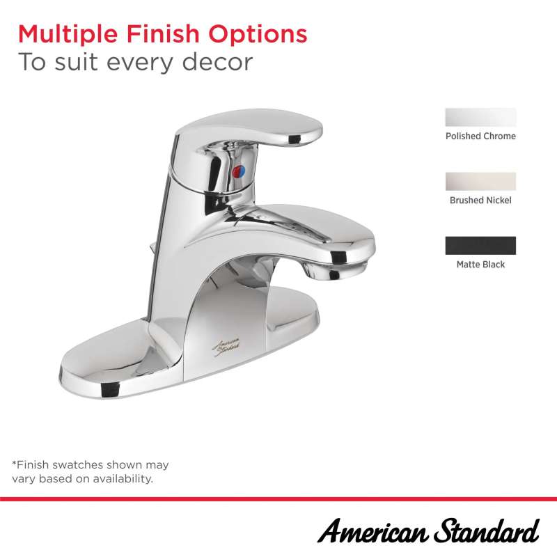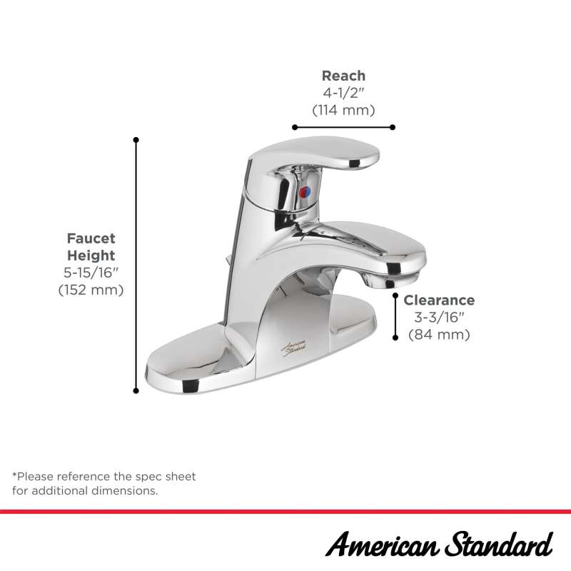 The Colony Pro single-handle centerset bathroom faucet from American Standard provides excellent performance, style, and value. This single-handle faucet is WaterSense certified with a maximum flow rate of 1.2 gallons per minute to help save water. Memory position valving allows the user to turn the faucet on and off at a preferred temperature with no adjustments required.