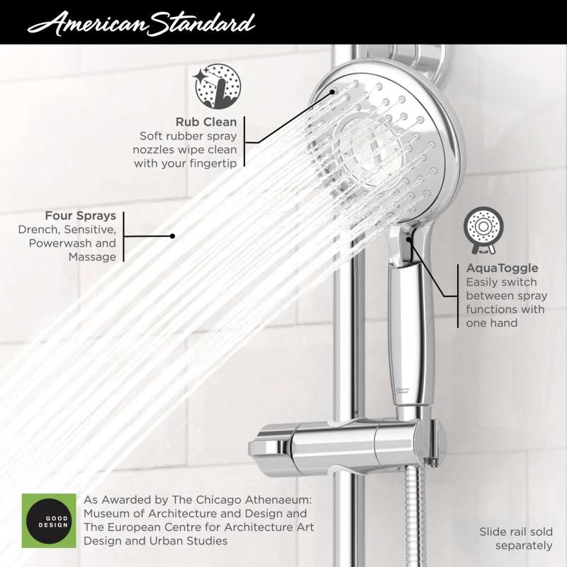 The Spectra+ Handheld(TM) 4-function hand shower from American Standard has all the functionality of a stable shower head, with the convenience of a hand shower. The Spectra+ hand shower allows each user to select from either a Drench, Sensitive, Powerwash(TM), and Massage setting for a custom shower experience that will maximize your relaxation and showering experience.