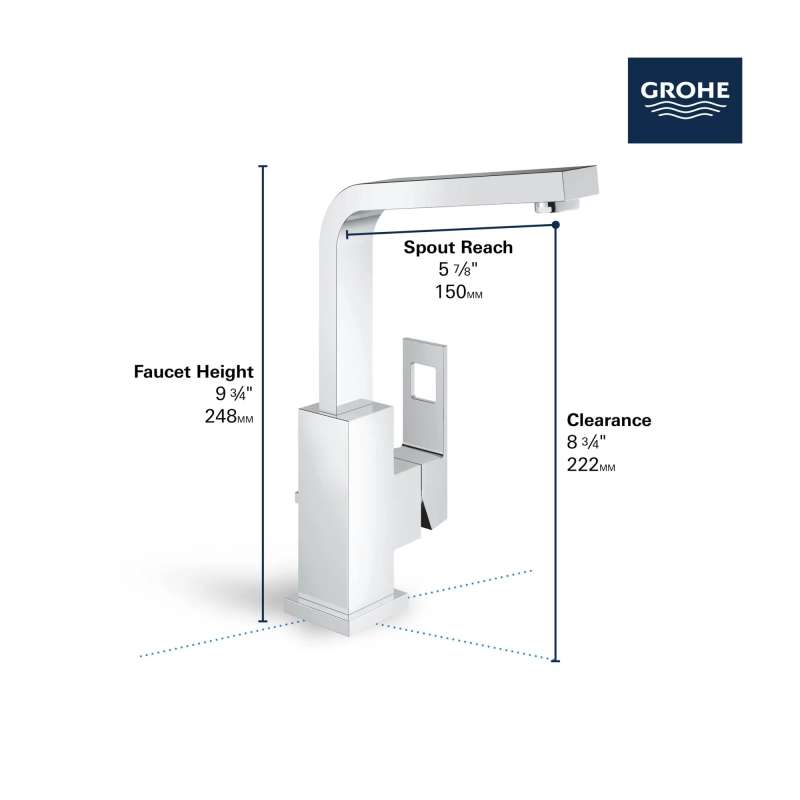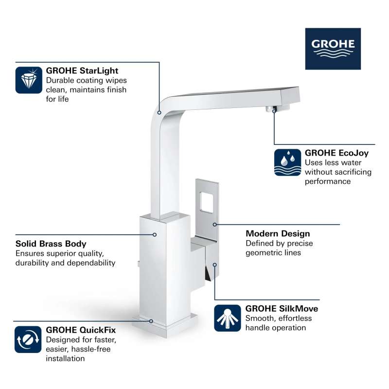 The Eurocube Single-Handle Bathroom Faucet from GROHE is defined by the precise angles that make modern design so appealing. Engineered for lasting beauty and functional excellence, the Eurocube faucet features renowned GROHE technologies that result in ultra-smooth handle motion, durable, long-lasting finishes, and an eco-friendly ethos for water conservation.