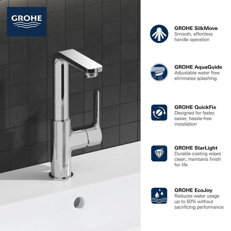 Clean, unpretentious lines define the GROHE Lineare Bathroom Faucet. This contemporary faucet is equipped with exclusive GROHE technology including GROHE SilkMove for smooth, precise handle operation, and GROHE EcoJoy to reduce water usage without sacrificing performance. Lineare is engineered with the precision and craftsmanship that have made GROHE the choice for discerning homeowners.
