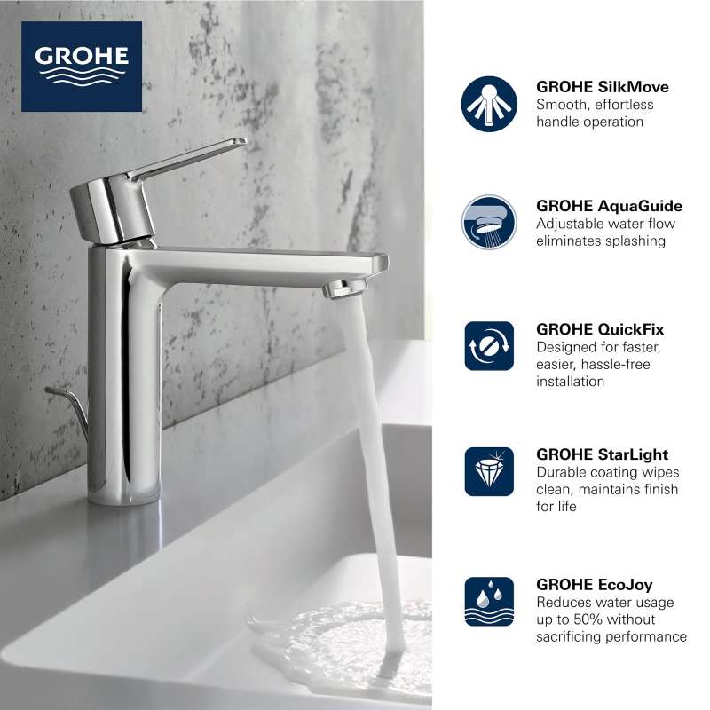 Clean, unpretentious lines define the GROHE Lineare Single Handle Bathroom Faucet. This contemporary faucet is equipped with exclusive GROHE technology including GROHE SilkMove for smooth, precise handle operation, and GROHE EcoJoy to reduce water usage without sacrificing performance. Lineare is engineered with the precision and craftsmanship that have made GROHE the choice for discerning homeowners.