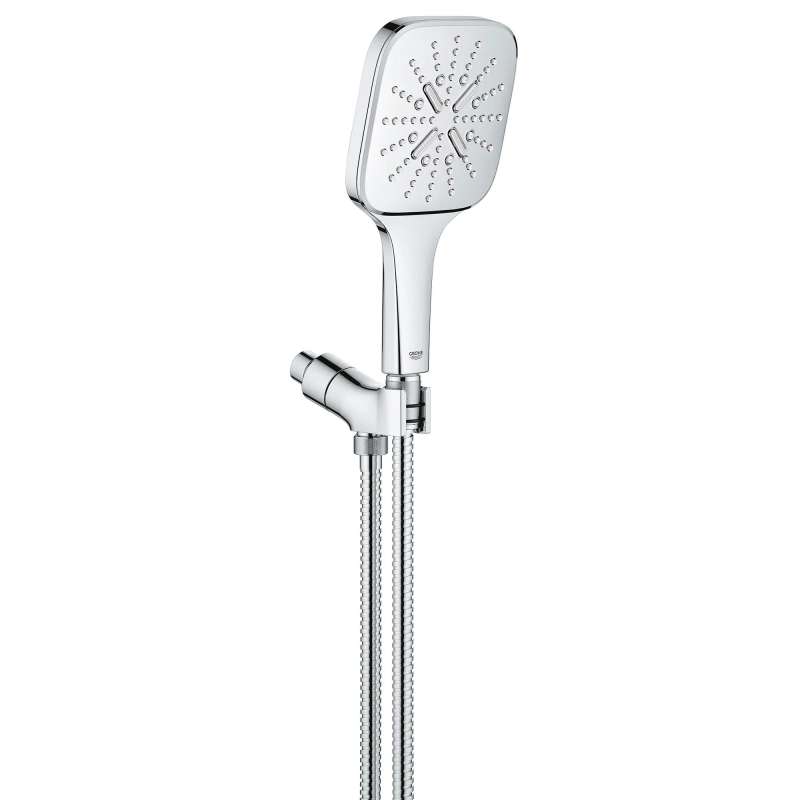 Defined by its sleek profile and designed to soothe and satisfy, the GROHE Rainshower SmartActive Hand Shower features three essential spray functions with fingertip control. This intuitive hand shower delivers an invigorating Rain spray, a stress-reducing ActiveMassage spray, and a Jet spray for a post-workout power shower. Engineered with the GROHE SmartTip control to switch between sprays with fingertip ease, this slim, minimalist design is enhanced by an ergonomic handle for a secure, comfortable grip. Set includes hand shower, bracket and 59" metal hose.