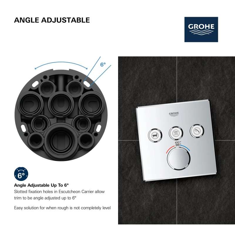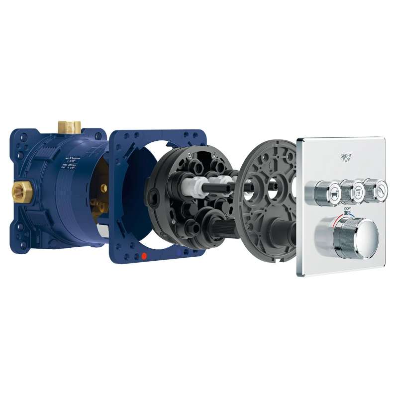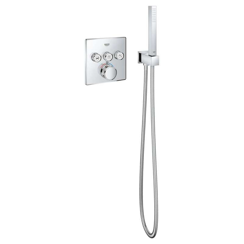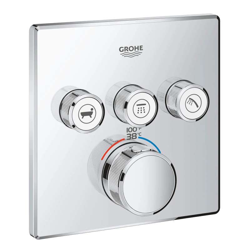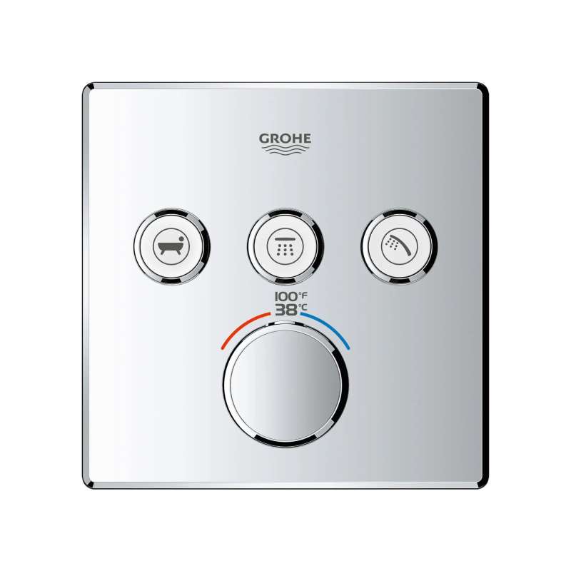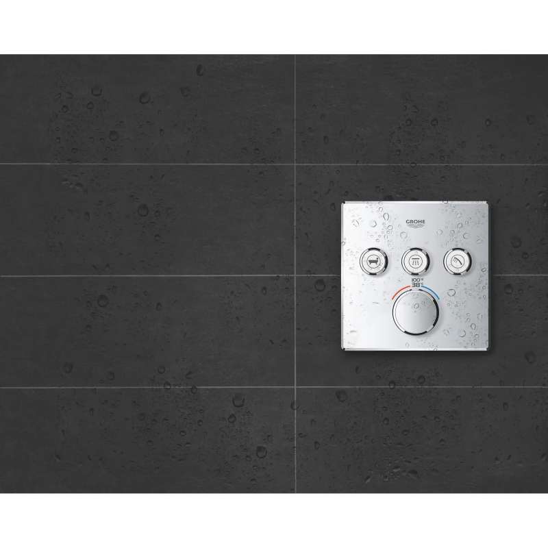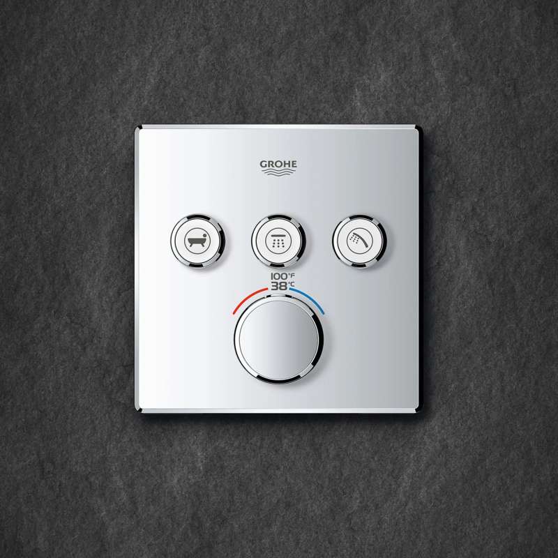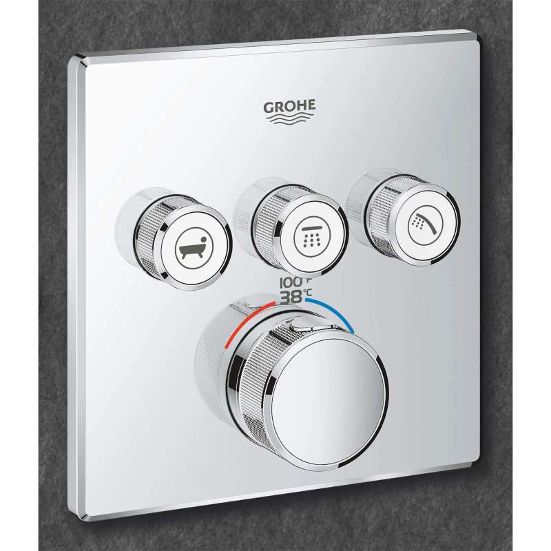 The Grohtherm SmartControl Triple Function Thermostatic Trim from GROHE is a slim, contemporary design that will enhance any bathroom and make showering more enjoyable. Innovative and intuitive to use, the triple-function SmartControl lets you adjust water volume for up to three spray sources with the simple push-turn of a button. Easily switch between sprays, experience each spray individually or enjoy all three at the same time. It features integrated GROHE Turbostat technology to keep water temperature consistent for the duration of your shower, preventing any unpleasant hot/cold fluctuations. Please note that this product must be installed in combination with the GROHE Rapido SmartBox (35601000).