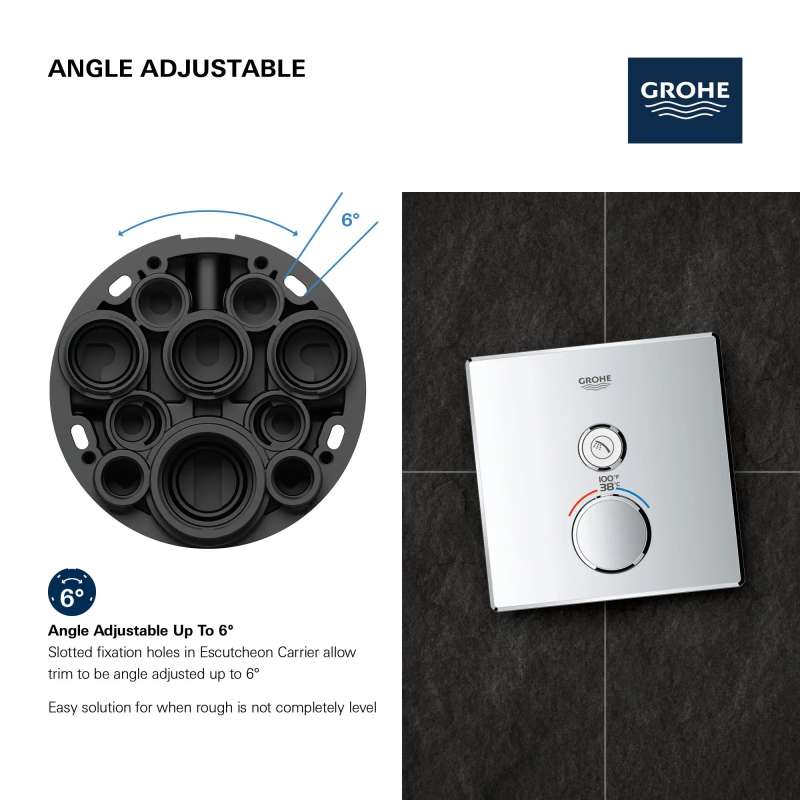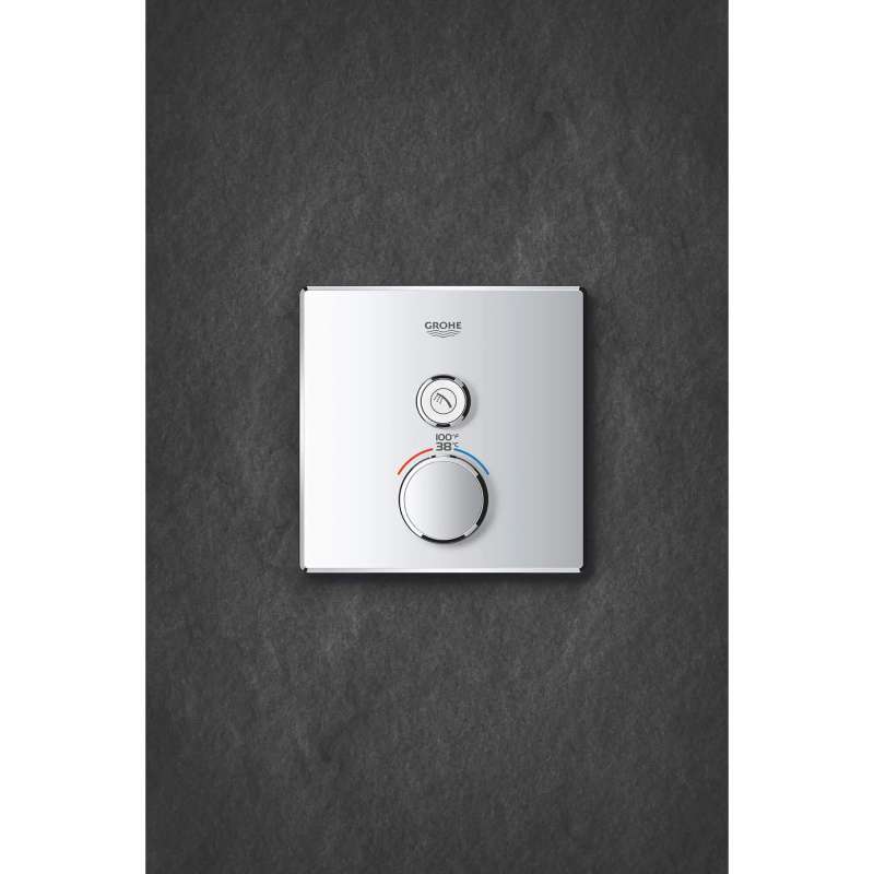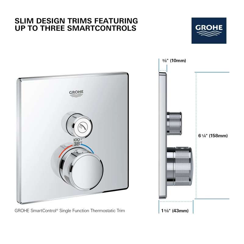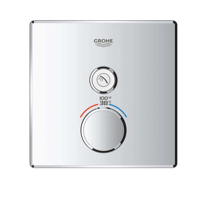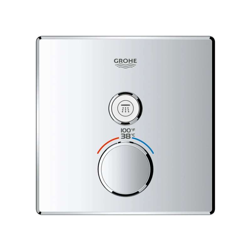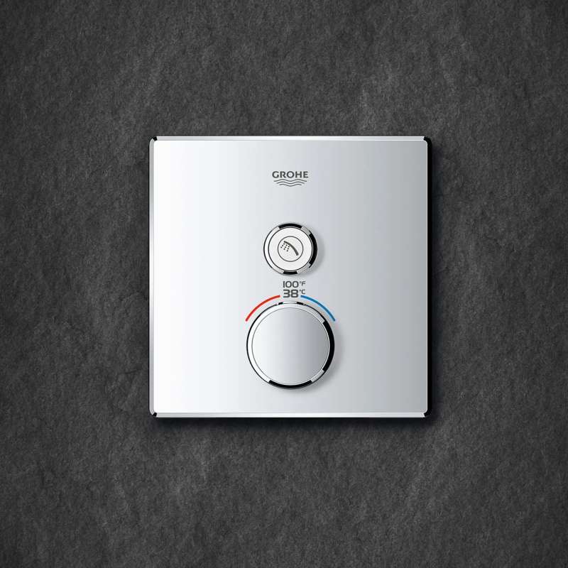The Grohtherm SmartControl Single Function Thermostatic Trim from GROHE is a slim, contemporary design that will enhance any bathroom. This innovative, single-function SmartControl allows you to adjust water volume from one spray source with the simple push-turn of a button. It features integrated GROHE Turbostat technology to keep water temperature consistent for the duration of your shower, preventing any unpleasant hot/cold fluctuations. Please note that this product must be installed in combination with the GROHE Rapido SmartBox (35601000).