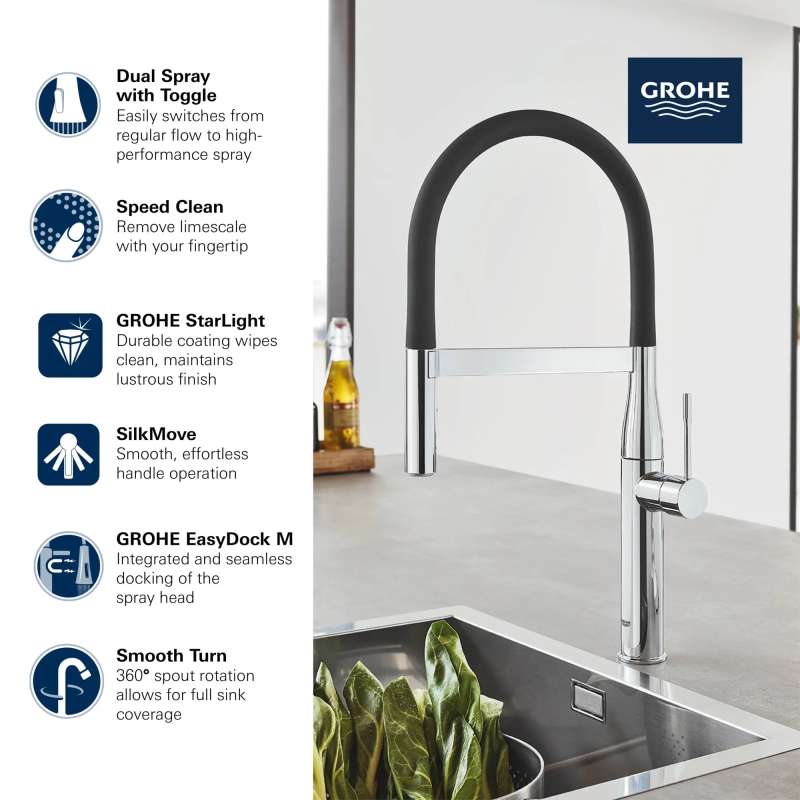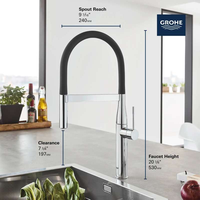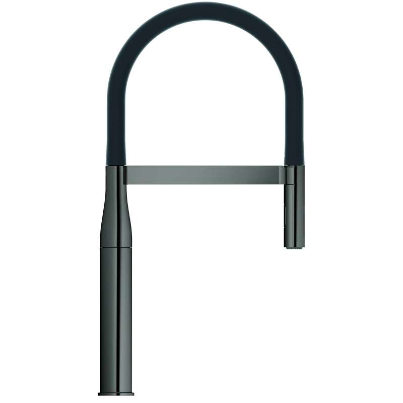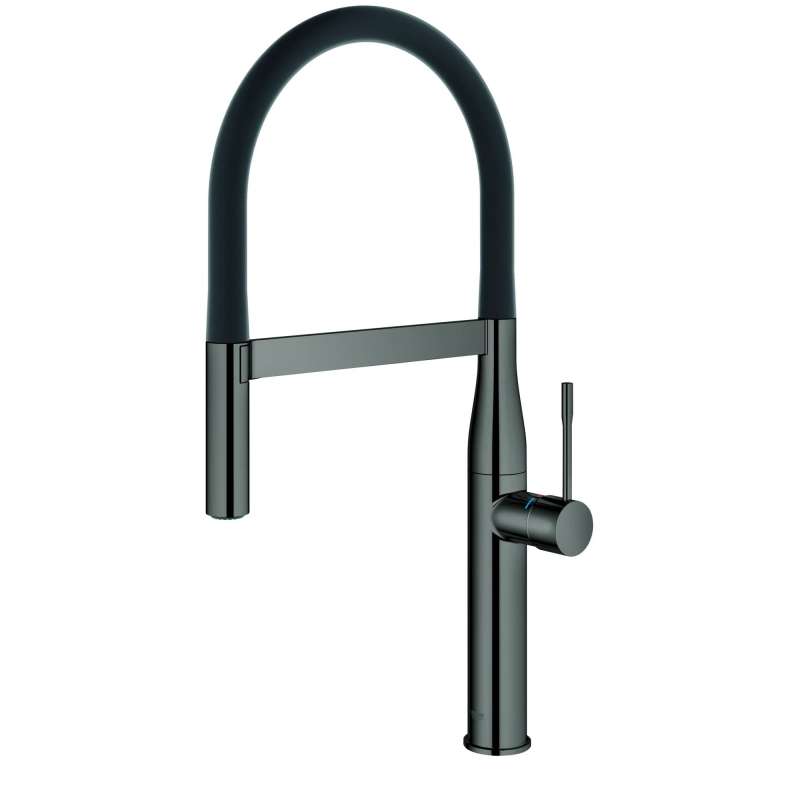 Reflecting minimalist beauty in its purest form, the GROHE Essence New Semi-Pro Single-Handle Dual Spray Kitchen Faucet is a natural choice for today's cosmopolitan kitchen. This elegant single-hole kitchen faucet features a flexible, high-arched black hose spout with integrated spring to reach every corner of the sink. The dual function spray head with toggle function offers seamless switching between spray and regular water flow. Equipped with a forward-rotating lever handle to eliminate backsplash interference, the Essence New Single-Handle Kitchen Faucet allows for easy placement in any kitchen design. Flexible hose spout is available in multiple colors, sold separately, and easily snaps in place for a whole new look. See Model 30321_0 for details.