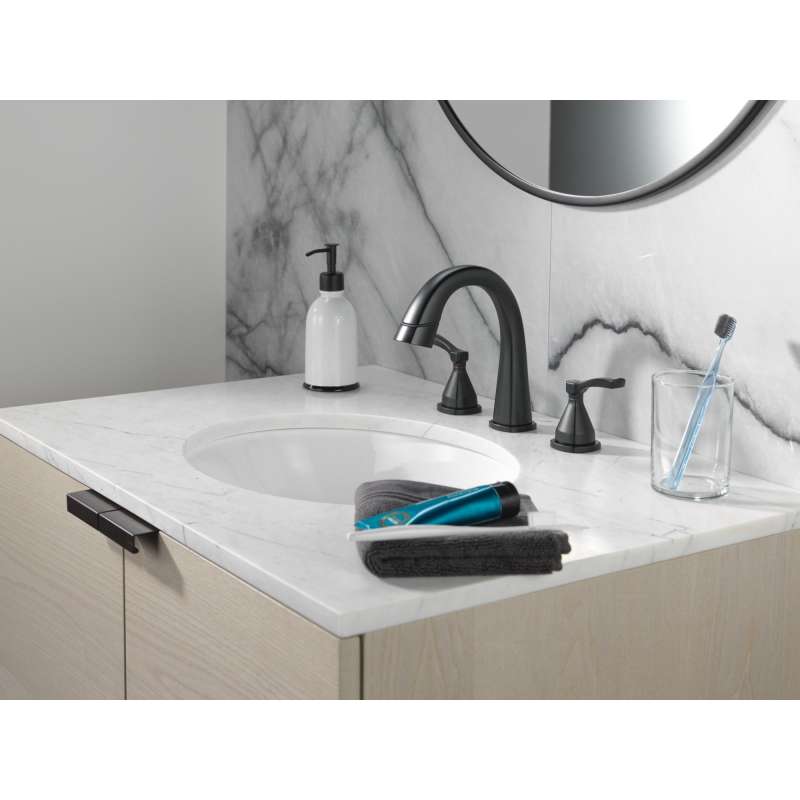 With subtly upturned spout and handles, the stryke bath collection radiates confidence and composure with an assured stature and ascending contours. The pull-down spray wand features delta magnatite docking which uses a powerful integrated magnet to pull your faucet spray wand precisely into place and hold it there so it stays docked when not in use. The worry-free drain catch is a simple solution to the common problem of pills, jewelry or other valuables washing down the drain. Delta faucets with diamond seal technology perform like new for life with a patented design that reduces leak points, is less hassle to install and lasts twice as long as the industry standard. Delta watersense labeled faucets use at least 20% less water than the industry standard — helping you save water without compromising performance. You can install with confidence, knowing that delta faucets are backed by our lifetime limited warranty.