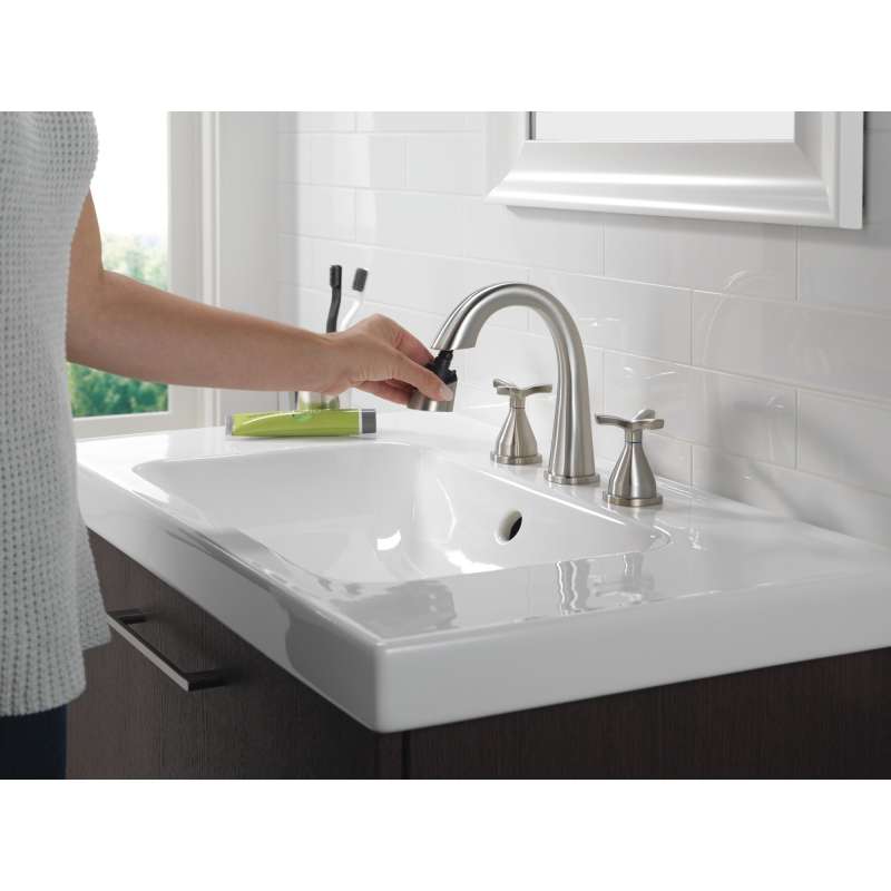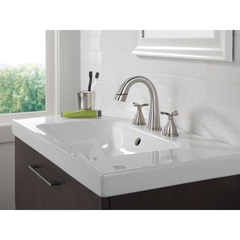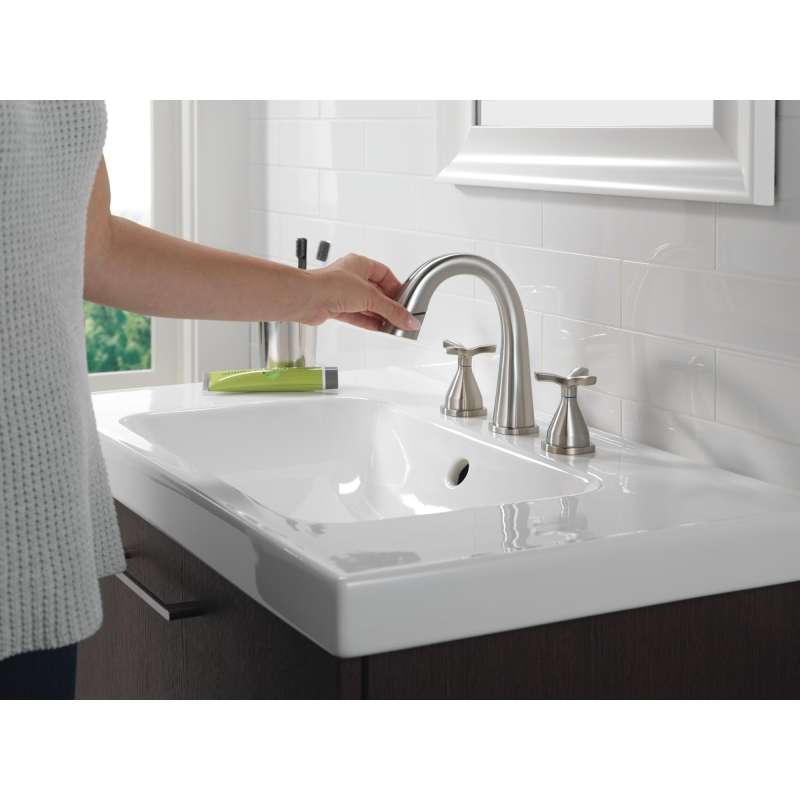 With subtly upturned spout and helo spoke handles, the stryke bath collection radiates confidence and composure with an assured stature and ascending contours. The pull-down spray wand features delta magnatite docking which uses a powerful integrated magnet to pull your faucet spray wand precisely into place and hold it there so it stays docked when not in use. The worry-free drain catch is a simple solution to the common problem of pills, jewelry or other valuables washing down the drain. Delta lumicoat finishes are guaranteed to resist water spots and mineral buildup and easily wipe clean without chemicals or cleaners. Delta faucets with diamond seal technology perform like new for life with a patented design that reduces leak points, is less hassle to install and lasts twice as long as the industry standard. Delta watersense labeled faucets use at least 20% less water than the industry standard — helping you save water without compromising performance. You can install with confidence, knowing that delta faucets are backed by our lifetime limited warranty.