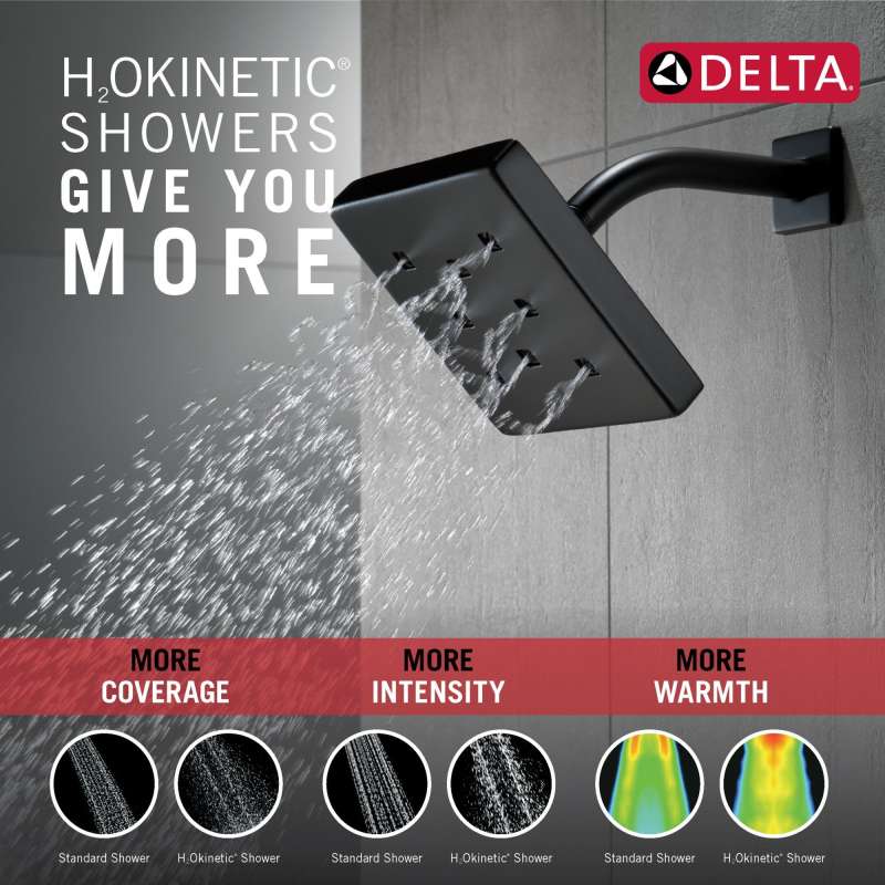 Delta H2Okinetic Showers look different because they are different. Using advanced technology, H2Okinetic showers sculpt water into a unique pattern, giving you 3X the coverage of a standard shower head.* The end result is a shower that provides more coverage, more warmth and more intensity for a truly drenching shower experience. So go ahead and indulge, because now you can enjoy the feeling of more water without using more water. Matte Black makes a statement in your space, cultivating a sophisticated air and coordinating flawlessly with most other fixtures and accents. With bright tones, Matte Black is undeniably modern with a strong contrast, but it can complement traditional or transitional spaces just as well when paired against warm neutrals for a rustic feel akin to cast iron. Delta WaterSense labeled faucets, showers and toilets use at least 20% less water than the industry standard—saving you money without compromising performance. *Coverage measured in accordance with EPA WaterSense Specification for shower heads, March 4, 2010.