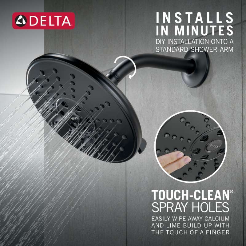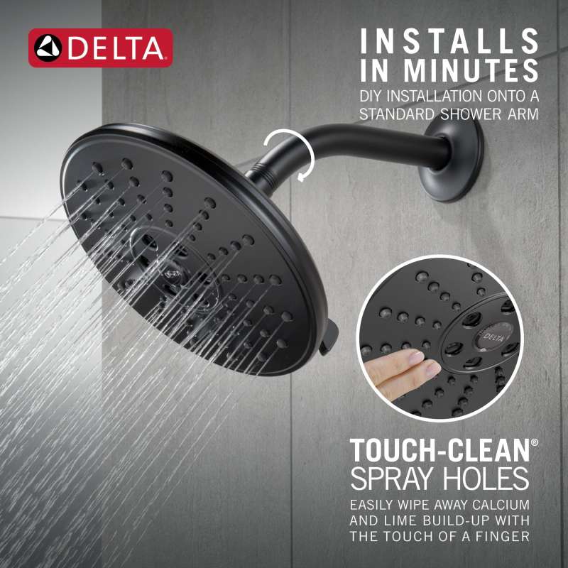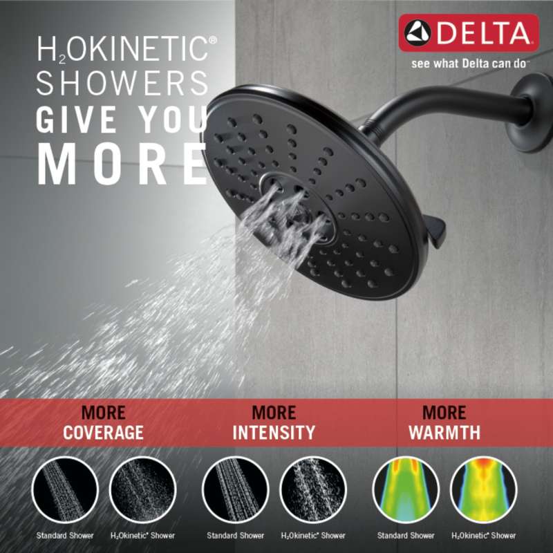 Replacing your shower head is one of the quickest, simplest upgrades you can make to your shower. Our shower heads feature a wide range of styles and innovations, and install in less than 20 minutes - no special tools required. Delta H2Okinetic Showers look different because they are different. Using advanced technology, H2Okinetic showers sculpt water into a unique wave pattern, giving you 3X the coverage of a standard shower head. The end result is a shower that provides more coverage, more warmth and more intensity for a truly drenching shower experience. So go ahead and indulge, because now you can enjoy the feeling of more water without using more water. While other products may gather unsightly mineral build-up over time, Delta soft rubber Touch-Clean spray holes allow any mineral residue to simply be wiped away for an instantly refreshed look – with no need for soaking or the aid of chemical cleaners. The pause setting gives you ample space for shaving, lathering and other shower tasks, then easily restarts the water with the temperature where you left off. This spray setting helps you conserve water, so you can worry less about depleting your supply of hot water - and you help the environment too. Delta WaterSense labeled faucets, showers and toilets use at least 20% less water than the industry standard—saving you money without compromising performance.