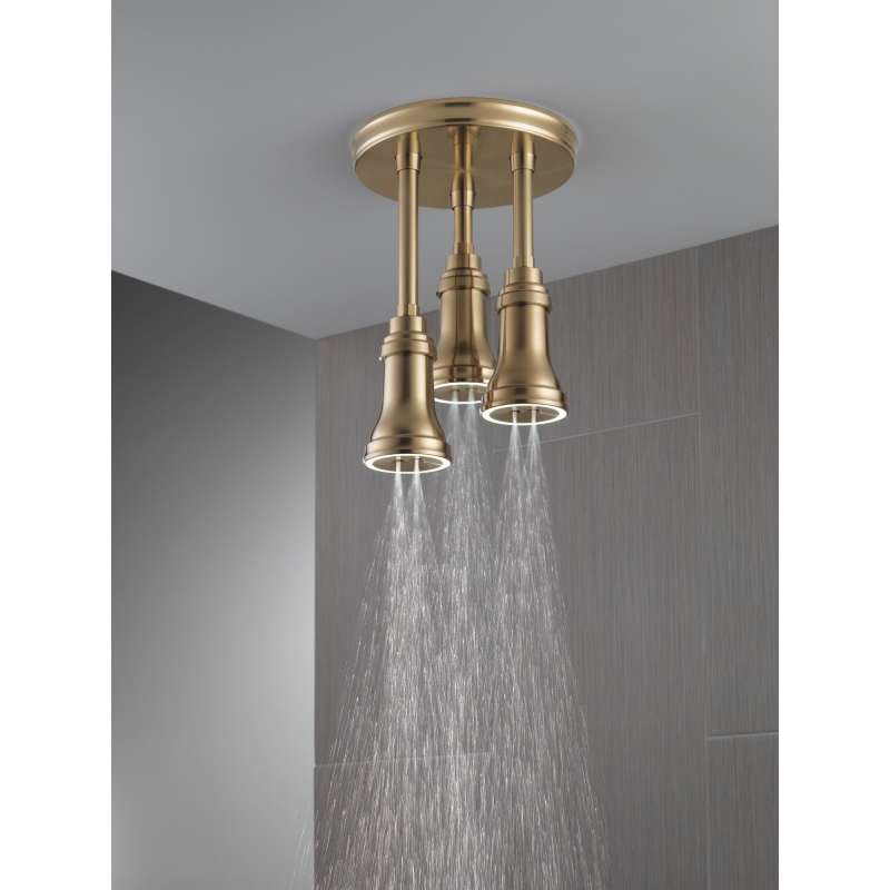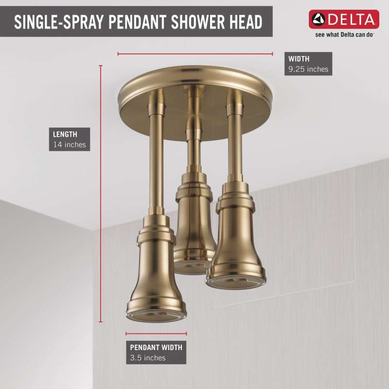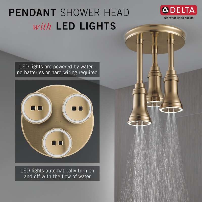 The centerpiece of any shower, Delta LED Pendant Raincan Shower Heads establish distinctive appeal in your space, blending cultivated designs with modern technologies. The tranquil illumination of the water-powered LED accent lights combines with H2Okinetic Technology for a soothing experience that transports you from shower to spa. The LED lights automatically turn on when water is running and turn off when water flow stops. The accent lights emit a subtle glow to provide soothing ambience, as opposed to serving as a bright, primary light source. Delta H2Okinetic Showers look different because they are different. Using advanced technology, H2Okinetic showers sculpt water into a unique pattern, giving you 3X the coverage of a standard shower head.* The end result is a shower that provides more coverage, more warmth and more intensity for a truly drenching shower experience. So go ahead and indulge, because now you can enjoy the feeling of more water without using more water. *Coverage measured in accordance with EPA WaterSense Specification for shower heads, March 4, 2010.