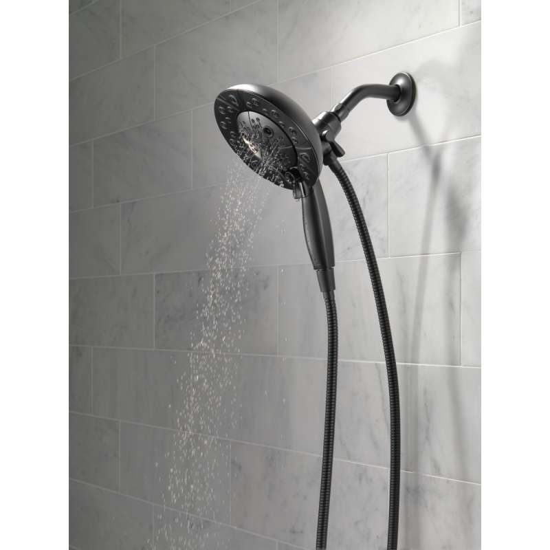 The Delta In2ition Two-in-One Shower features a detachable hand shower which can be used separately from or simultaneously with the shower head. This integrated dual-functionality gives you maximum flexibility without sacrificing warmth, as you can choose to have water streaming from the shower head only, the hand shower only or both the shower head and hand shower at once. Delta H2Okinetic PowerDrench Showers look different because they are different. H2Okinetic showers are powered by an innovative technology that sculpts the water into a unique wave pattern, giving you the feeling of more water without using more water and creating a shower with more warmth, coverage and intensity. So go ahead and indulge, because now you can enjoy the feeling of more water without using more water. Delta MagnaTite Docking uses a powerful integrated magnet to pull your faucet spray wand or In2ition hand shower precisely into place and hold it there so it stays docked when not in use. While other products may gather unsightly mineral build-up over time, Delta soft rubber Touch-Clean spray holes allow any mineral residue to simply be wiped away for an instantly refreshed look – with no need for soaking or the aid of chemical cleaners. The pause setting gives you ample space for shaving, lathering and other shower tasks, without worrying about overspray or water waste. This spray setting helps you conserve water, so you can worry less about depleting your supply of hot water - and you help the environment too.