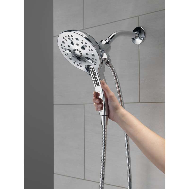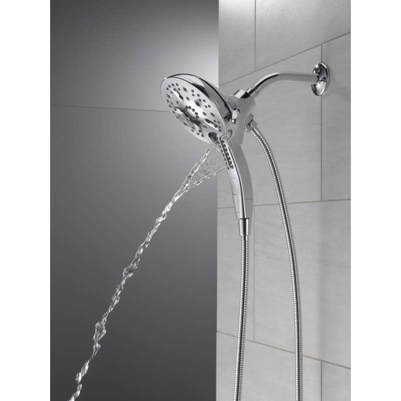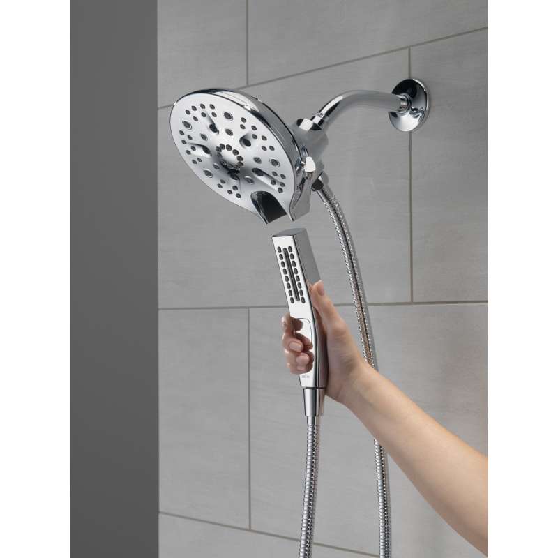 The Delta In2ition Two-in-One Shower features a detachable hand shower which can be used separately from or simultaneously with the shower head. This integrated dual-functionality gives you maximum flexibility without sacrificing warmth, as you can choose to have water streaming from the shower head only, the hand shower only or both the shower head and hand shower at once. Delta H2Okinetic PowerDrench Showers look different because they are different. H2Okinetic showers are powered by an innovative technology that sculpts the water into a unique wave pattern, giving you the feeling of more water without using more water and creating a shower with more warmth, coverage and intensity. So go ahead and indulge, because now you can enjoy the feeling of more water without using more water. Delta MagnaTite Docking uses a powerful integrated magnet to pull your faucet spray wand or In2ition hand shower precisely into place and hold it there so it stays docked when not in use. While other products may gather unsightly mineral build-up over time, Delta soft rubber Touch-Clean spray holes allow any mineral residue to simply be wiped away for an instantly refreshed look – with no need for soaking or the aid of chemical cleaners. The pause setting gives you ample space for shaving, lathering and other shower tasks, without worrying about overspray or water waste. This spray setting helps you conserve water, so you can worry less about depleting your supply of hot water - and you help the environment too.
