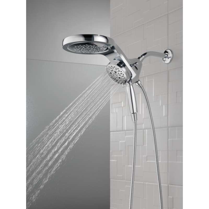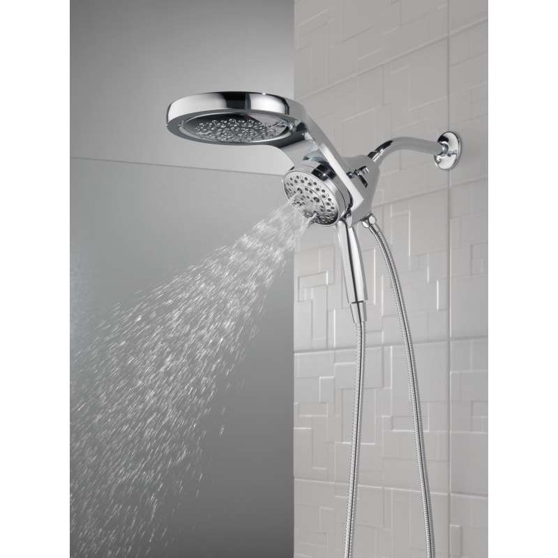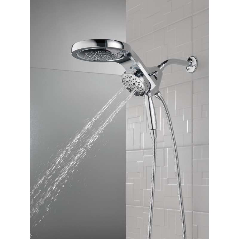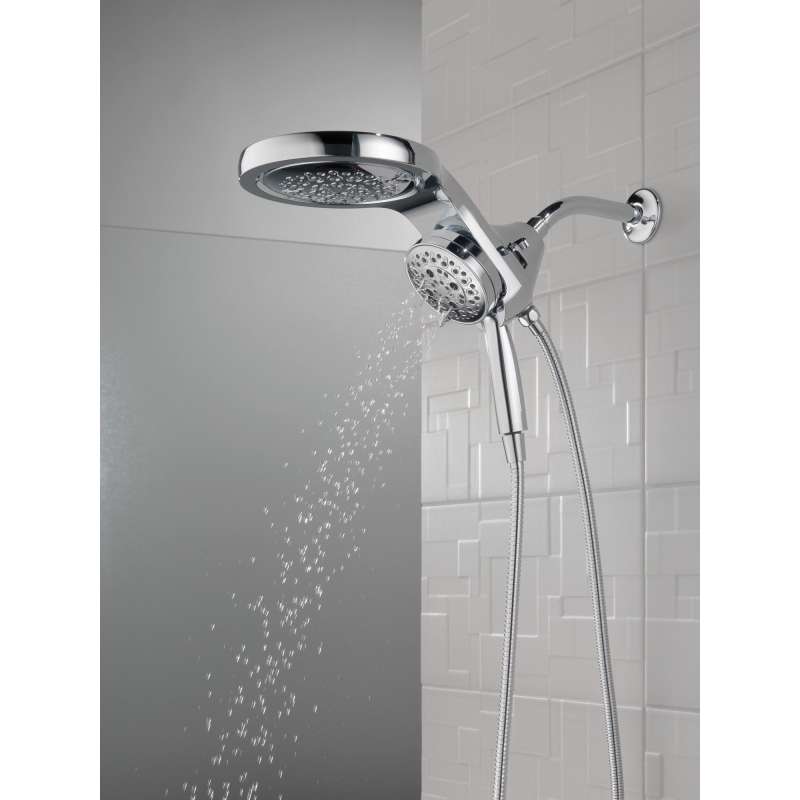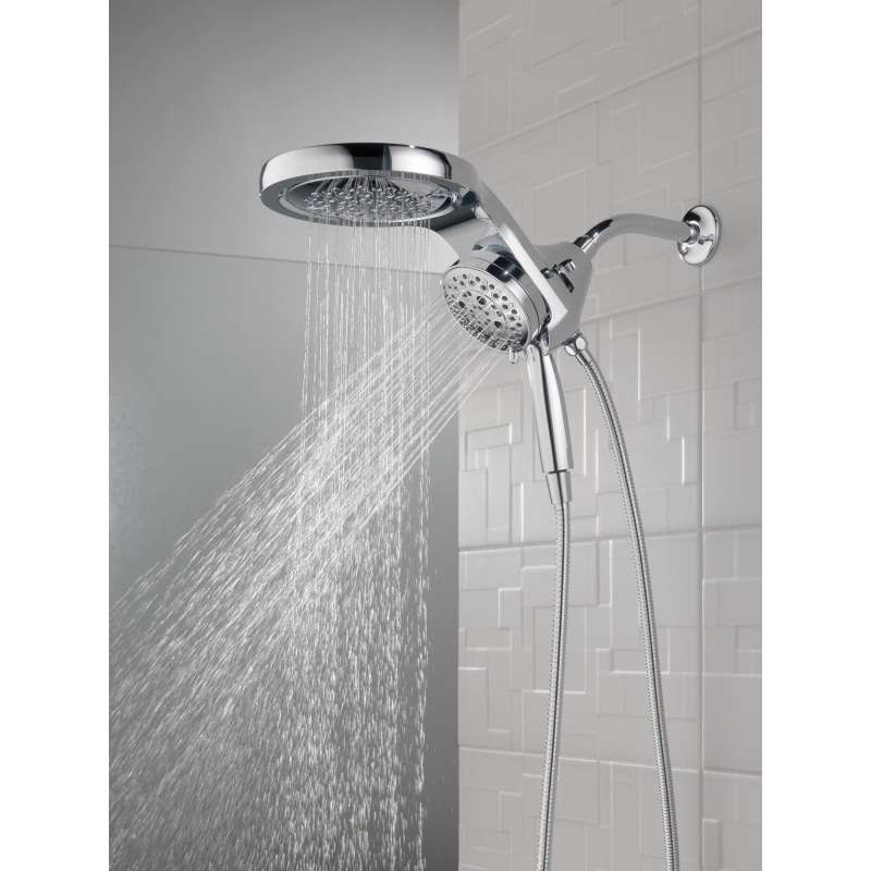 A Delta HydroRain H2Okinetic Two-in-One Shower Head with hand shower completely transforms your shower with dual shower head functionality, featuring an integrated raincan and hand shower. The power of the raincan and hand shower together creates an immersive, spa-like showering experience that you can install in minutes to a standard shower arm, without altering the plumbing behind the wall. The integrated hand shower stays put every time you dock thanks to MagnaTite Docking and provides maximum flexibility and control when you need it, while the H2Okinetic PowerDrench Spray feels like more water, warmth and intensity without using more water. Don’t just take a shower, transform it, with a Delta HydroRain Shower Head. While other products may gather unsightly mineral build-up over time, Delta soft rubber Touch-Clean spray holes allow any mineral residue to simply be wiped away for an instantly refreshed look – with no need for soaking or the aid of chemical cleaners. The pause setting gives you ample space for shaving, lathering and other shower tasks, without worrying about overspray or water waste. This spray setting helps you conserve water, so you can worry less about depleting your supply of hot water - and you help the environment too.