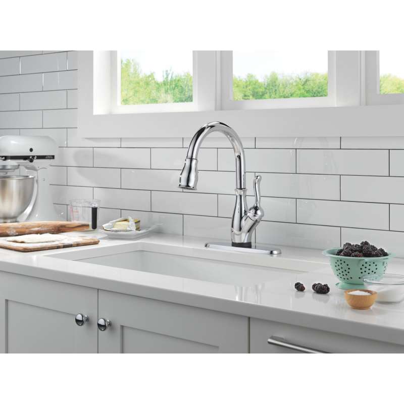 Traditional styling and modern functionality come together for a timeless look with the leland kitchen collection. Life moves fast, touchless technology keeps up. Delta touch2o faucets with touchless technology help keep germs and mess off your kitchen faucet and provides easy water control 3 ways: simply place your hand near the faucet, tap the faucet surface, or use standard handle activation. The tempsense led light changes color to alert you to the water’s temperature and eliminate any possible surprises or discomfort. Magnatite docking uses a powerful integrated magnet to pull your faucet spray wand precisely into place and hold it there so it stays docked when not in use. Shieldspray technology cleans with laser-like precision while containing mess and splatter. A concentrated jet powers away stubborn messes while an innovative shield of water contains splatter and clears off the mess, so you can spend less time soaking, scrubbing and shirt swapping. Delta faucets with diamond seal technology perform like new for life with a patented design which reduces leak points, is less hassle to install and lasts twice as long as the industry standard. You can install with confidence, knowing that delta faucets are backed by our lifetime limited warranty.
