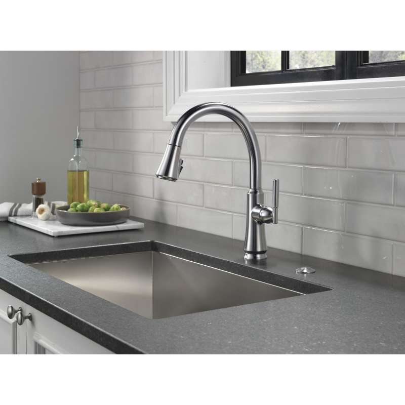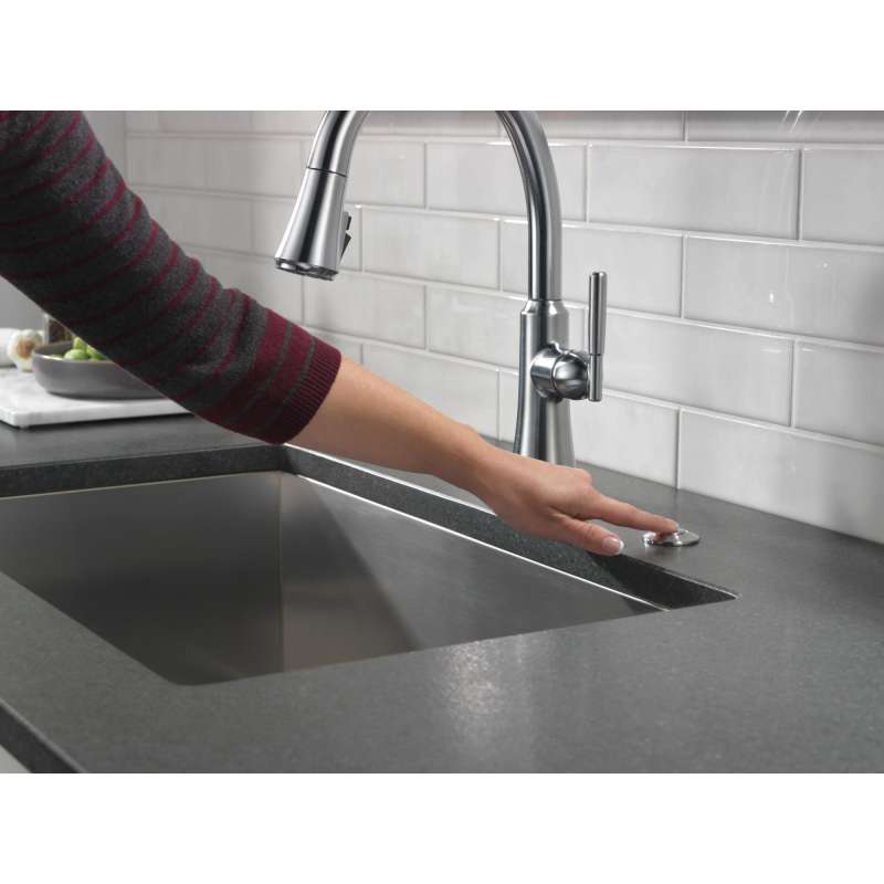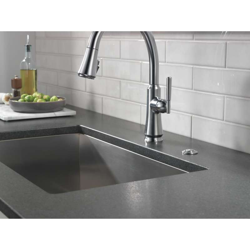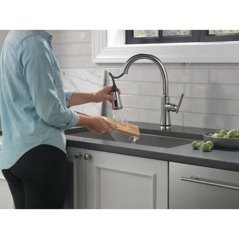 A contemporary take on traditional styling, the coranto kitchen collection brings everyday refinement to a space with subtle design details that nod to both the past and the present. Delta magnatite docking uses a powerful integrated magnet to set your pull down sprayer precisely into place and hold it there so it stays docked when not in use. Delta shieldspray technology cleans with laser-like precision while containing mess and splatter. A concentrated jet powers away stubborn messes while an innovative shield of water contains splatter and clears off the mess, so you can spend less time soaking, scrubbing and shirt swapping. Delta kitchen faucets with diamond seal technology perform like new for life with a patented design which reduces leak points, is less hassle to install and lasts twice as long as the industry standard. Kitchen sink faucets with touch-clean spray holes allow you to easily wipe away calcium and lime build-up with the touch of a finger. You can install with confidence, knowing that delta kitchen faucets are backed by our lifetime limited warranty. Industry standard is based on asme a112.18.1 of 500,000 cycles.