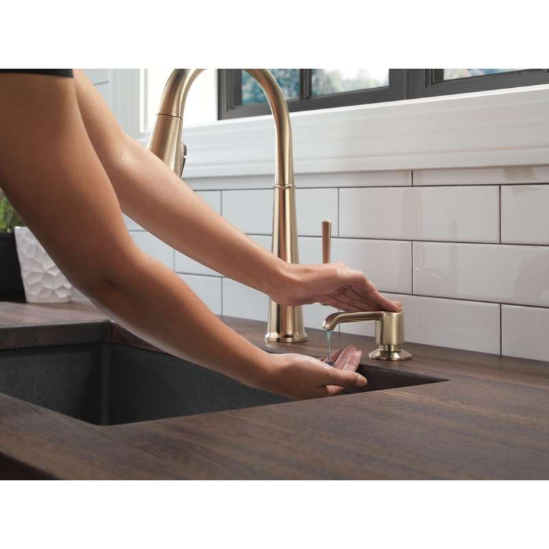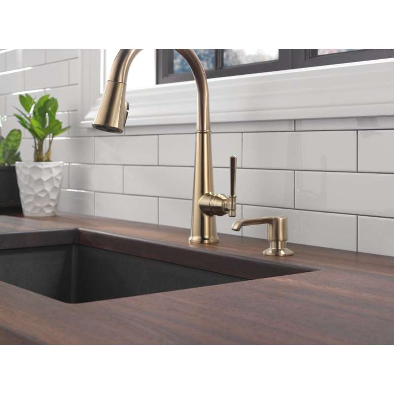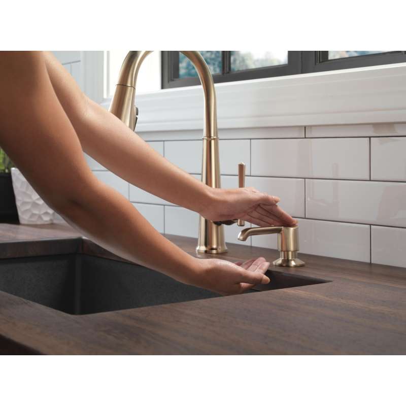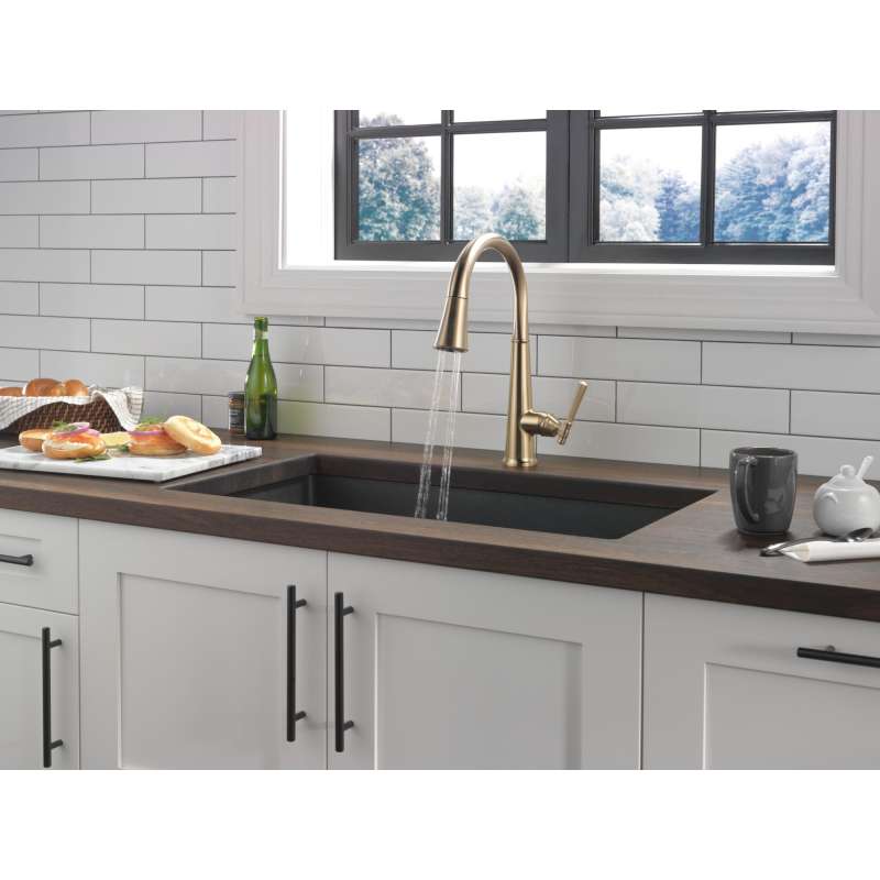 The defined ridges of the emmeline kitchen collection’s diamond-shaped spout cut a streamlined profile, balanced by captivating details that lend an elemental sense of old-world flair. Kitchen sink faucets with touch-clean spray holes allow you to easily wipe away calcium and lime build-up with the touch of a finger. Delta shieldspray technology cleans with laser-like precision while containing mess and splatter. A concentrated jet powers away stubborn messes while an innovative shield of water contains splatter and clears off the mess, so you can spend less time soaking, scrubbing and shirt swapping. Delta lumicoat finishes are guaranteed to resist water spots and mineral buildup and easily wipe clean without the need for cleaners or chemicals. The ultra-sleek surface repels liquids, resisting water spots and staying cleaner longer, so your faucet stays beautiful. Delta kitchen faucets with diamond seal technology perform like new for life with a patented design which reduces leak points, is less hassle to install and lasts twice as long as the industry standard. You can install with confidence, knowing that delta kitchen faucets are backed by our lifetime limited warranty.
