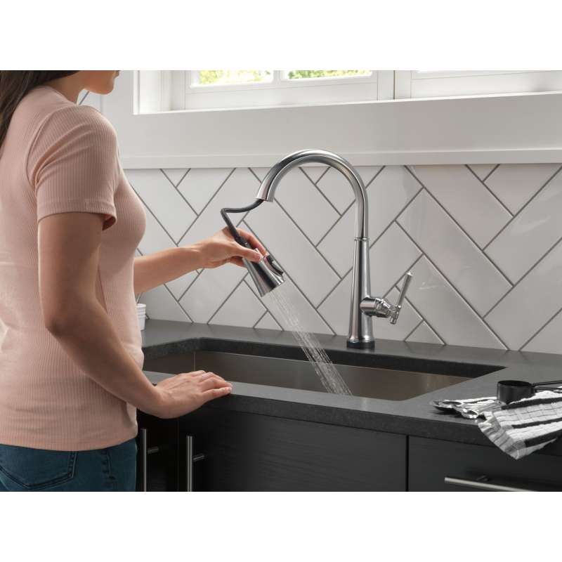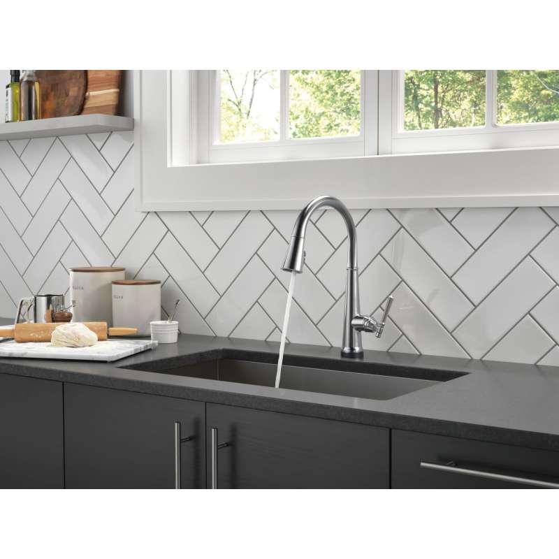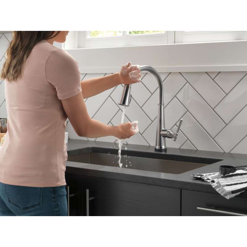 The defined ridges of the emmeline kitchen collection’s diamond-shaped spout cut a streamlined profile, balanced by captivating details that lend an elemental sense of old-world flair. Touch it on. Touch it off. Whether you have two full hands or 10 messy fingers, delta touch2o technology helps keep your kitchen faucet clean, even when your hands aren’t. A simple touch anywhere on the spout or handle with your wrist or forearm activates the flow of water at the temperature where your handle is set. The delta tempsense led light changes color to alert you to the water’s temperature and eliminates any possible surprises or discomfort. Kitchen sink faucets with touch-clean spray holes allow you to easily wipe away calcium and lime build-up with the touch of a finger. Delta shieldspray technology cleans with laser-like precision while containing mess and splatter. A concentrated jet powers away stubborn messes while an innovative shield of water contains splatter and clears off the mess, so you can spend less time soaking, scrubbing and shirt swapping. Delta lumicoat finishes are guaranteed to resist water spots and mineral buildup and easily wipe clean without the need for cleaners or chemicals. The ultra-sleek surface repels liquids, resisting water spots and staying cleaner longer, so your faucet stays beautiful. Delta kitchen faucets with diamond seal technology perform like new for life with a patented design which reduces leak points, is less hassle to install and lasts twice as long as the industry standard. You can install with confidence, knowing that delta kitchen faucets are backed by our lifetime limited warranty. Electronic parts are backed by our 5-year electronic parts warranty.