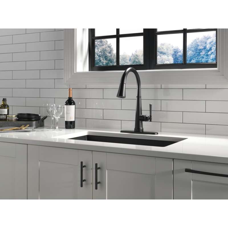 The defined ridges of the emmeline kitchen collection’s diamond-shaped spout cut a streamlined profile, balanced by captivating details that lend an elemental sense of old-world flair. Touch it on. Touch it off. Whether you have two full hands or 10 messy fingers, delta touch2o technology helps keep your kitchen faucet clean, even when your hands aren’t. A simple touch anywhere on the spout or handle with your wrist or forearm activates the flow of water at the temperature where your handle is set. The delta tempsense led light changes color to alert you to the water’s temperature and eliminates any possible surprises or discomfort. Kitchen sink faucets with touch-clean spray holes allow you to easily wipe away calcium and lime build-up with the touch of a finger. Delta shieldspray technology cleans with laser-like precision while containing mess and splatter. A concentrated jet powers away stubborn messes while an innovative shield of water contains splatter and clears off the mess, so you can spend less time soaking, scrubbing and shirt swapping. Delta kitchen faucets with diamond seal technology perform like new for life with a patented design which reduces leak points, is less hassle to install and lasts twice as long as the industry standard. You can install with confidence, knowing that delta kitchen faucets are backed by our lifetime limited warranty. Electronic parts are backed by our 5-year electronic parts warranty.