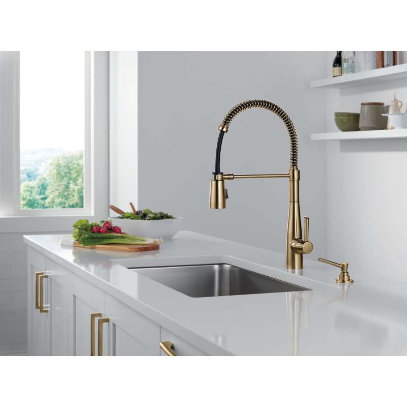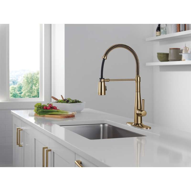 The essa pro kitchen faucet is a soft, modern take on euro design with subtle detailing accents. With its striking coil-spring design, the essa pro kitchen faucet can serve as the centerpiece of any contemporary kitchen, while the high-arc gooseneck spring-spout offers maximum flexibility out of any pull-down style faucet. Delta magnatite docking uses a powerful integrated magnet to set your pull down sprayer precisely into place and hold it there so it stays docked when not in use. You can install with confidence, knowing that delta kitchen faucets are backed by our lifetime limited warranty.