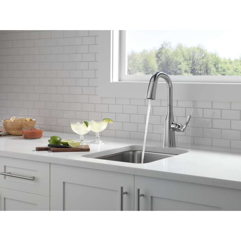 With subtly upturned spout and handles, stryke kitchen collection faucets radiate confidence and include thoughtful innovations to enhance everyday use. Delta magnatite docking uses a powerful integrated magnet to set your pull down sprayer precisely into place and hold it there so it stays docked when not in use. Delta lumicoat finishes are guaranteed to resist water spots and mineral buildup and easily wipe clean without the need for cleaners or chemicals. The ultra-sleek surface repels liquids, resisting water spots and staying cleaner longer, so your faucet stays beautiful. You can install with confidence, knowing that delta kitchen faucets are backed by our lifetime limited warranty.