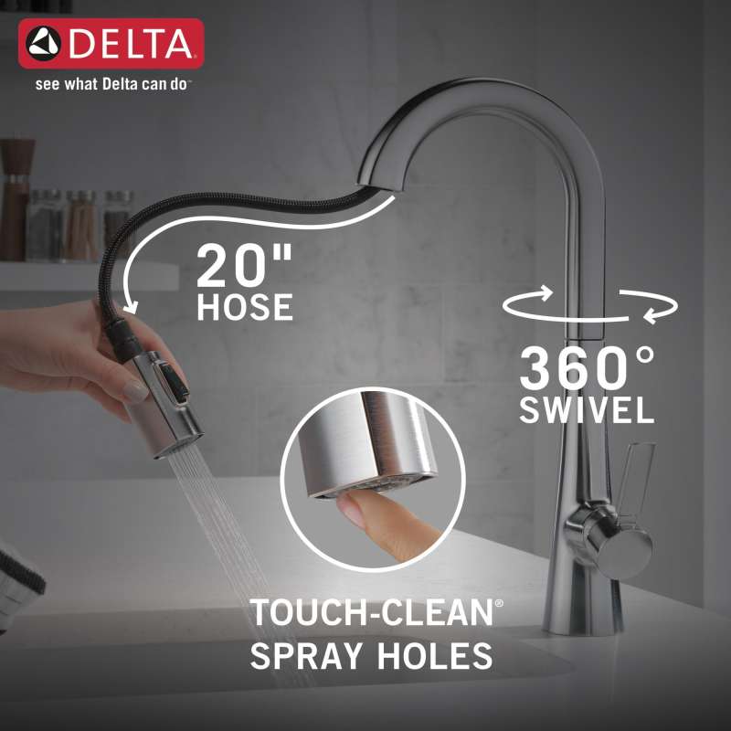 The monrovia kitchen collection stands out in any space with its statuesque form and striking handle design. Delta magnatite docking uses a powerful integrated magnet to set your pull down sprayer precisely into place and hold it there so it stays docked when not in use. Delta lumicoat finishes are guaranteed to resist water spots and mineral buildup and easily wipe clean without the need for cleaners or chemicals. The ultra-sleek surface repels liquids, resisting water spots and staying cleaner longer, so your faucet stays beautiful. You can install with confidence, knowing that delta kitchen faucets are backed by our lifetime limited warranty.
