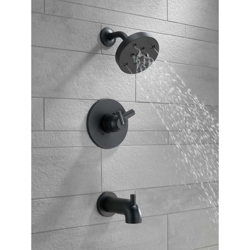 Inspired by the sleek elegance of modern European design, the Trinsic Bath Collection completes the look of any contemporary bath, from classic to rustic. Delta H2Okinetic Showers look different because they are different. Using advanced technology, H2Okinetic showers sculpt water into a unique wave pattern, giving you 3X the coverage of a standard shower head. The end result is a shower that provides more coverage, more warmth and more intensity for a truly drenching shower experience. With separate handles for volume and temperature control, this Delta tub/shower provides a more refined showering experience. Simply set the water at your preferred temperature and turn the shower on or off with the volume control handle - without interrupting your set temperature. Delta pressure-balance valves use Monitor Technology to protect you and your family from sudden temperature changes. Matte Black makes a statement in your space, cultivating a sophisticated air and coordinating flawlessly with most other fixtures and accents. With bright tones, Matte Black is undeniably modern with a strong contrast, but it can complement traditional or transitional spaces just as well when paired against warm nuetrals for a rustic feel akin to cast iron. Delta WaterSense labeled faucets, showers and toilets use at least 20 percent less water than the industry standard—saving you money without compromising performance.