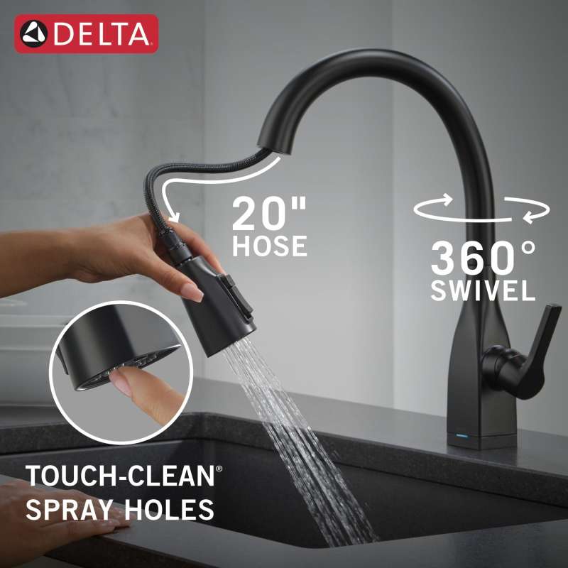 Touch it on. Touch it off. Whether you have two full hands or 10 messy fingers, delta touch2o technology helps keep your faucet clean, even when your hands aren’t. A simple touch anywhere on the spout or handle with your wrist or forearm activates the flow of water at the temperature where your handle is set. The delta tempsense led light changes color to alert you to the water’s temperature and eliminate any possible surprises or discomfort. Delta magnatite docking uses a powerful integrated magnet to pull your faucet spray wand precisely into place and hold it there so it stays docked when not in use. Delta shieldspray technology cleans with laser-like precision while containing mess and splatter. A concentrated jet powers away stubborn messes while an innovative shield of water contains splatter and clears off the mess, so you can spend less time soaking, scrubbing and shirt swapping. Delta faucets with diamond seal technology perform like new for life with a patented design which reduces leak points, is less hassle to install and lasts twice as long as the industry standard. Kitchen faucets with touch-clean spray holes allow you to easily wipe away calcium and lime build-up with the touch of a finger. You can install with confidence, knowing that delta faucets are backed by our lifetime limited warranty. Electronic parts are backed by our 5-year electronic parts warranty. Industry standard is based on asme a112.18.1 of 500,000 cycles.