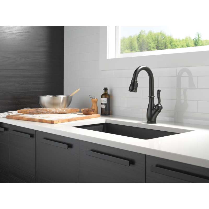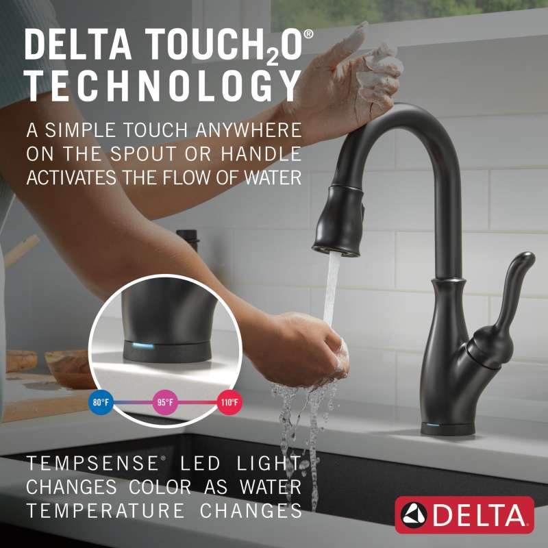 Touch it on. Touch it off. Whether you have two full hands or 10 messy fingers, delta touch2o technology helps keep your faucet clean, even when your hands aren’t. A simple touch anywhere on the spout or handle with your wrist or forearm activates the flow of water at the temperature where your handle is set. The delta tempsense led light changes color to alert you to the water’s temperature and eliminate any possible surprises or discomfort. Delta magnatite docking uses a powerful integrated magnet to pull your faucet spray wand precisely into place and hold it there so it stays docked when not in use. Delta faucets with diamond seal technology perform like new for life with a patented design which reduces leak points, is less hassle to install and lasts twice as long as the industry standard. Kitchen faucets with touch-clean spray holes allow you to easily wipe away calcium and lime build-up with the touch of a finger. You can install with confidence, knowing that delta faucets are backed by our lifetime limited warranty. Electronic parts are backed by our 5-year electronic parts warranty. Industry standard is based on asme a112.18.1 of 500,000 cycles.