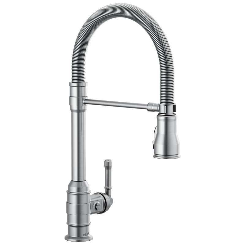 The powerful features of the broderick collection take center stage in the kitchen, with an industrial style that alludes to a rich heritage. The collection includes distinctive bridge faucet and pull-down spring spout faucet options that add a unique element to any kitchen. Styled after the rugged nuts and bolts of machinery, it serves as a true centerpiece in the kitchen. Take control of your kitchen with the flexible, spring-design undocking spout, which can be easily disconnected then magnetically re-docked for free range of motion. When docked, the broderick pro faucet still operates as a true pull-down faucet with magnatite docking. Kitchen sink faucets with touch-clean spray holes allow you to easily wipe away calcium and lime build-up with the touch of a finger. Delta shieldspray technology cleans with laser-like precision while containing mess and splatter. A concentrated jet powers away stubborn messes while an innovative shield of water contains splatter and clears off the mess, so you can spend less time soaking, scrubbing and shirt swapping. Delta kitchen faucets with diamond seal technology perform like new for life with a patented design which reduces leak points, is less hassle to install and lasts twice as long as the industry standard. Kitchen sink faucets with touch-clean spray holes allow you to easily wipe away calcium and lime build-up with the touch of a finger. You can install with confidence, knowing that delta kitchen faucets are backed by our lifetime limited warranty. Industry standard is based on asme a112.18.1 of 500,000 cycles.