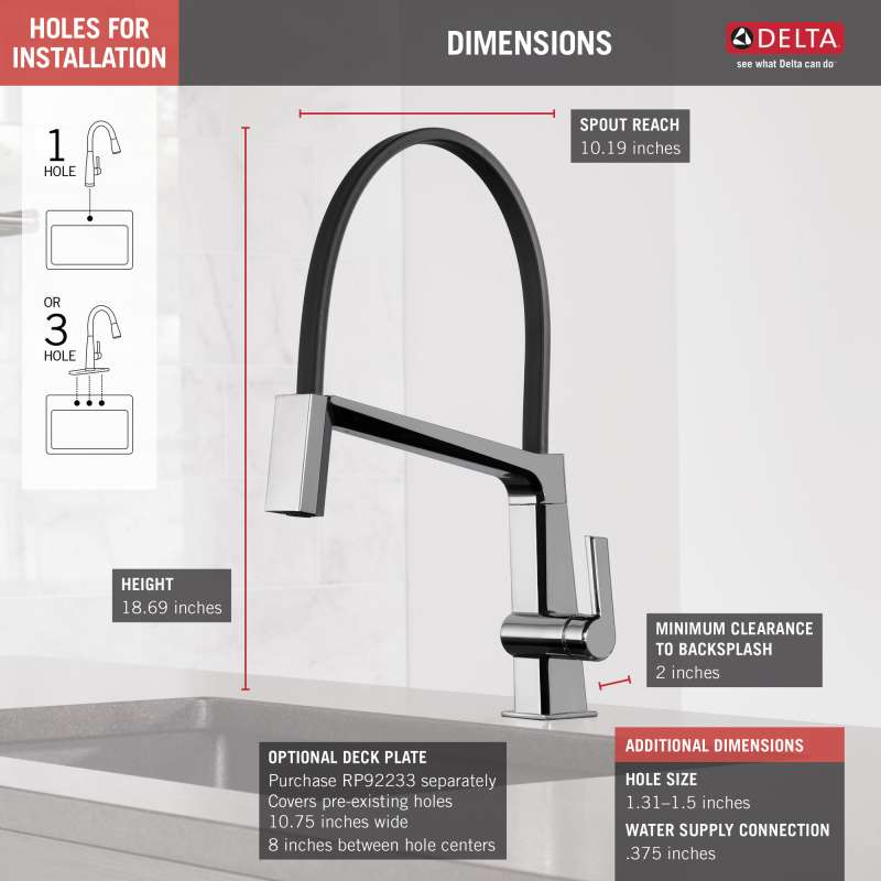 The confident slant of the Pivotal Collection makes it a striking addition to your kitchen's contemporary geometry for a look that makes a statement. Delta MagnaTite Docking uses a powerful integrated magnet to pull your faucet spray wand precisely into place and hold it there so it stays docked when not in use. Delta faucets with DIAMOND Seal Technology perform like new for life with a patented design which reduces leak points, is less hassle to install and lasts twice as long as the industry standard. You can install with confidence, knowing that Delta faucets are backed by our Lifetime Limited Warranty. Industry standard is based on ASME A112.18.1 of 500,000 cycles.